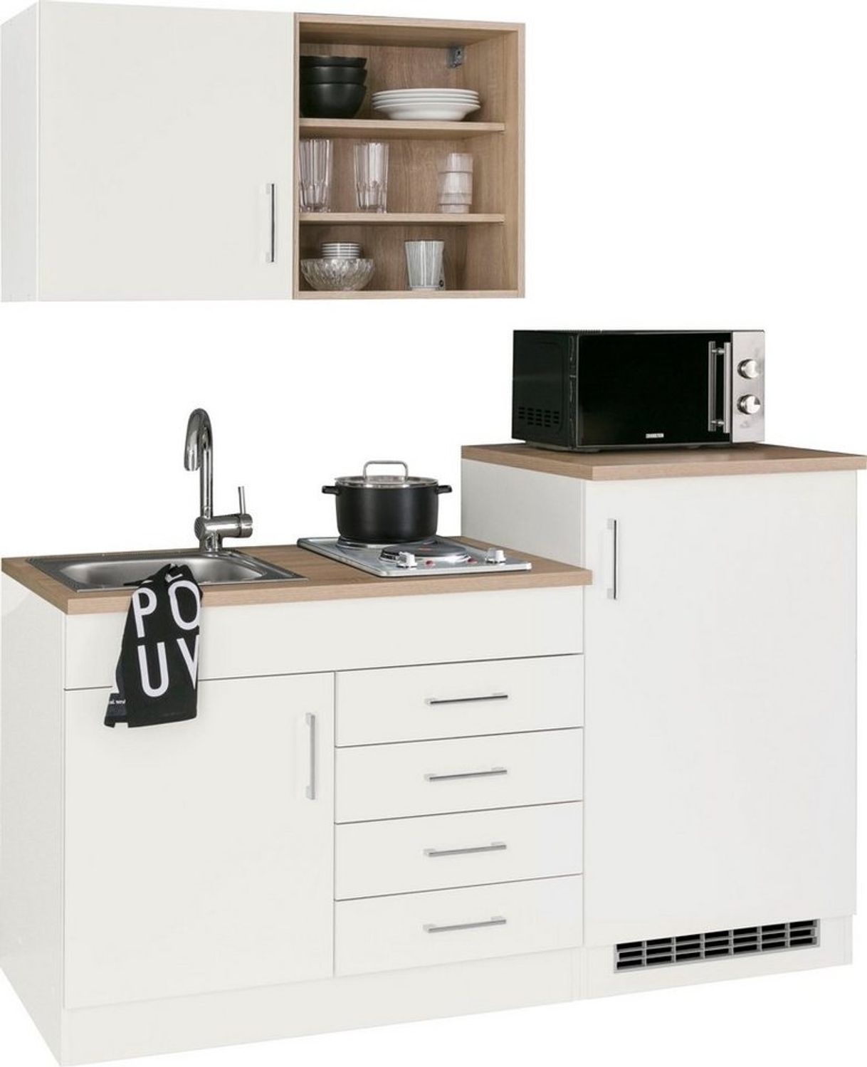 Praktisch und modern präsentiert sich die kompakte Küchenzeile »KS-Mali« von KOCHSTATION. Mit einer Breite von 160 cm bietet sie ausreichend Stauraum und ist aus Holzwerkstoff mit pflegeleichter Melaminbeschichtung gefertigt. Der Hängeschrank kombiniert offenen und geschlossenen Stauraum, während der Spülenschrank und der Vorratsschrank mit Schubladen zusätzlichen Platz bieten. Integrierte Entlüftung im Kühlumbauschrank und eine variable Arbeitsplatte runden das Angebot ab. **Highlights** - Kompakte Breite von 160 cm für platzsparende Nutzung - Pflegeleichte Melaminbeschichtung für einfache Reinigung - Offener und geschlossener Stauraum im Hängeschrank - Integrierte Entlüftung im Kühlumbauschrank - Variable Arbeitsplatte ohne Ausschnitte für flexible Anordnung **Produkteigenschaften** - Material: Holzwerkstoff - Hängeschrank mit höhenverstellbaren Regalböden - Spülenschrank und Vorratsschrank mit Schubladen - Möglichkeit zur Erweiterung über Eck **Lieferumfang** - Kühlschrank - Edelstahl-Einbauspüle - Arbeitsplatte ohne Ausschnitte