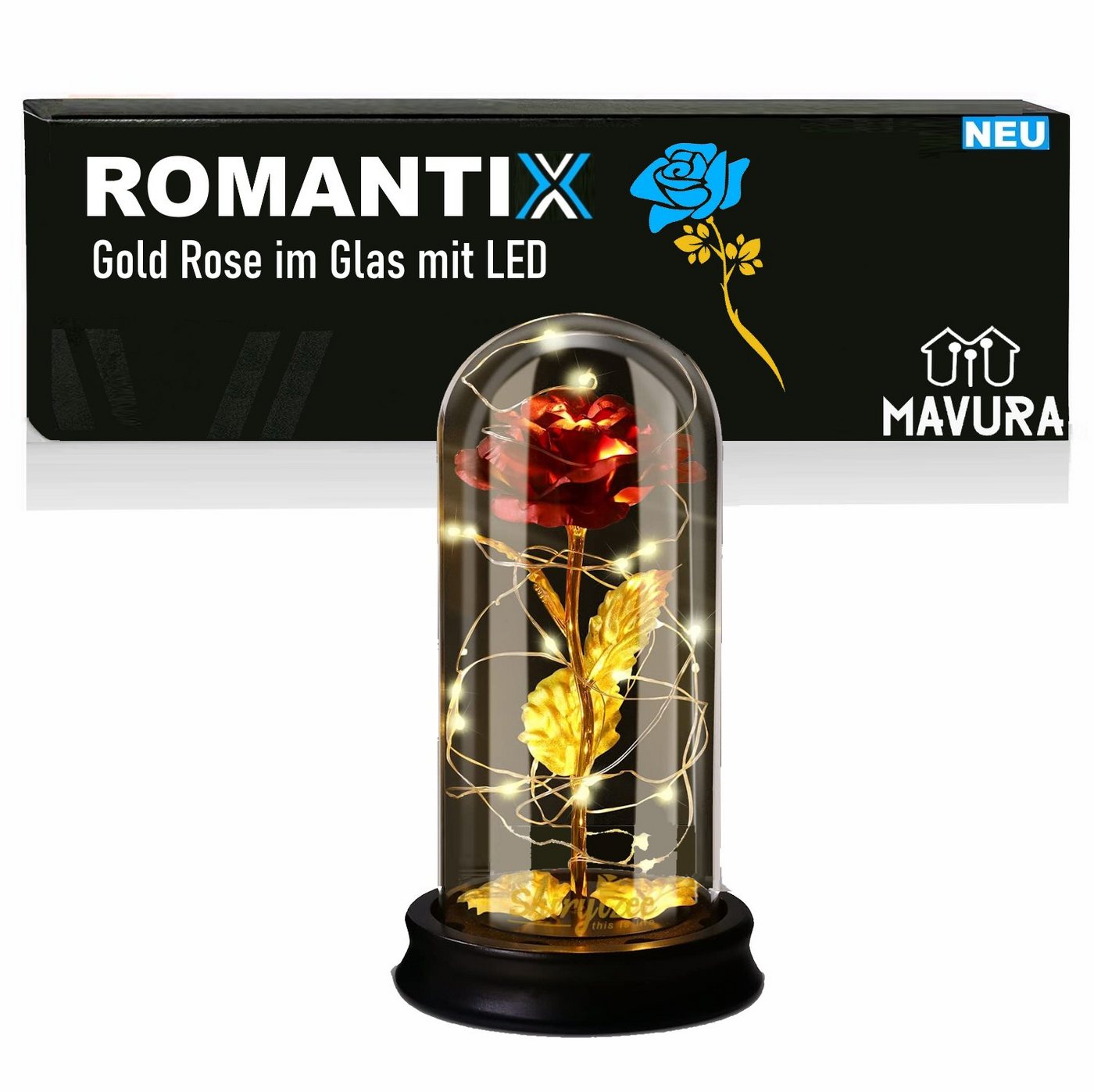MAVURA ROMANTIX Ewige Rose im Glas - LED Goldrose - goldene Rose mit LichtValentinstag Muttertag Geschenk