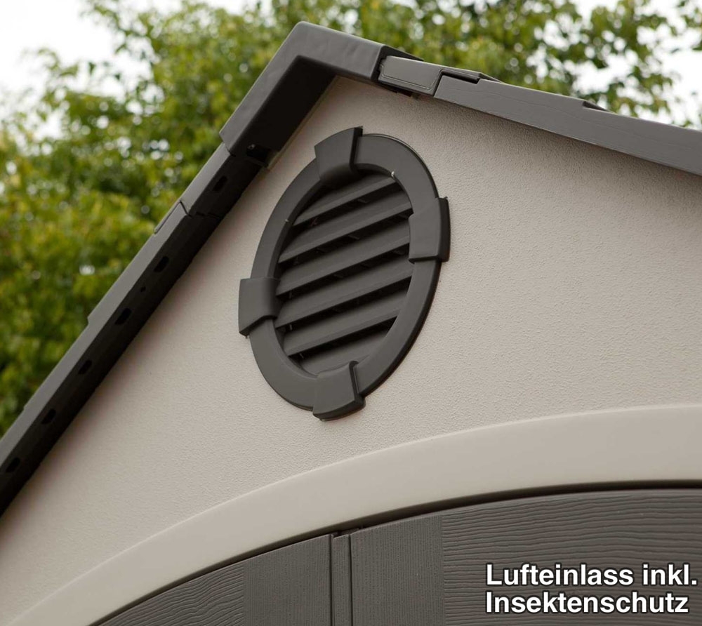 Das Lifetime Kunststoff Gerätehaus Jubiläumshaus ist das stabilste Kunststoffgerätehaus auf dem Markt. Hergestellt aus doppelwandigem, metallverstärktem HDPE-Kunststoff, bietet es außergewöhnliche Stabilität und Langlebigkeit. Die Dachkonstruktion aus Hochleistungsstahl trägt eine Traglast von bis zu 195 kg/m² und sorgt für schnelles Ablaufen von Wasser und Schnee. Das Gerätehaus ist wetterfest, UV-beständig und für den ganzjährigen Outdoor-Betrieb geeignet. Der einfache Aufbau und die wartungsfreie Nutzung machen es zur idealen Lösung für Ihren Garten. **Highlights** - Stabilste und langlebigste Kunststoff-Gerätehäuser auf dem Markt - Konstruktion aus doppelwandigem, metallverstärktem HDPE-Kunststoff - Hochleistungsstahl-Dachkonstruktion mit einer Traglast von bis zu 195 kg/m² - Wetterfest, UV-beständig und für den ganzjährigen Outdoor-Betrieb geeignet - Einfacher Aufbau und wartungsfrei **Produkteigenschaften** - Abmessungen: 244 x 305 x 244 cm - Farbe: Lichtgrau - Material: doppelwandiger, metallverstärkter HDPE-Kunststoff - Wetterfest und UV-beständig - Einfacher Zugang durch große Doppeltür - Trägt Schneelasten bis zu 115 kg/m² - 10 Jahre Garantie auf das komplette Haus **Lieferumfang** - Anti-Rutsch-Boden - 2x Lufteinlass mit Insektenschutz - Lichteinlass über den kompletten First - 2x Fenster an der Frontseite - 2x Lichteinlass in der Tür - 2x Regal 228 x 25 cm - Werkzeugtasche (s. Türe)