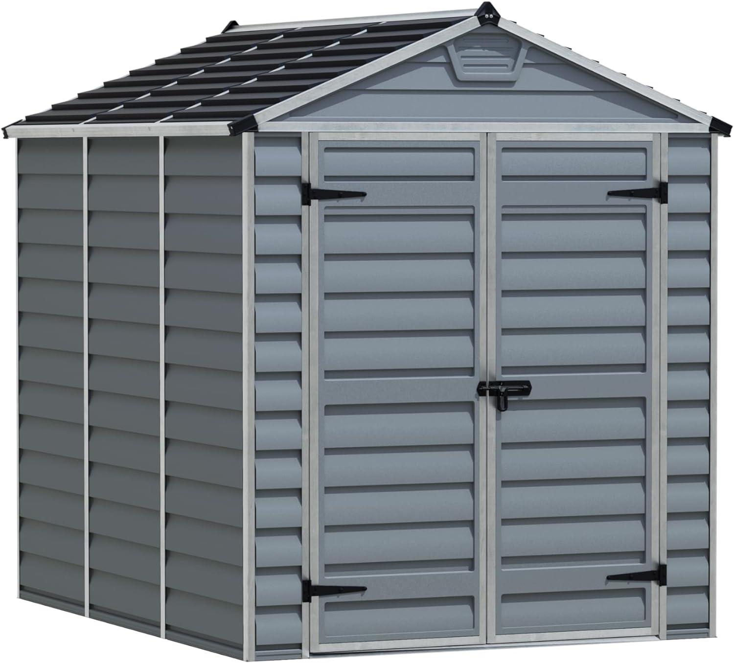 Das Palram - Canopia Kunststoff Gerätehaus Skylight 68 bietet Ihnen einen robusten und effizienten Stauraum für Ihren Garten. Mit hochwertigen Kunststoffpaneelen und einem wartungsfreien Aluminiumrahmen ist es ideal für die ganzjährige Nutzung. Die einzigartigen Sky Light™ Polycarbonat-Dachpaneele sind blickdicht und lassen dennoch Tageslicht hindurch. Belüftungsöffnungen sorgen für eine optimale Luftzirkulation. Mit den Abmessungen von 229 x 185 x 217 cm bietet es ausreichend Platz für Ihre Gartengeräte und Möbel. **Highlights** - Sky Light™ Paneele — super dünn, flexibel, extrem stabil! - Sky Light™ Dachpaneele sind blickdicht, aber lichtdurchlässig - 100% UV-beständig - Wartungsfreier Aluminiumrahmen - Niedrige Türschwelle und breite Doppeltür für leichten Zugang **Produkteigenschaften** - Abmessungen: 229 x 185 x 217 cm - Farbe: Dunkelgrau - Material: Kunststoffpaneele mit Aluminiumrahmen - Sky Light™ Polycarbonat-Dachpaneele - Belüftungsöffnungen auf der Vorder- und Rückseite - Abschließbare Türschlösser - Einfache Montage mit 2 Personen **Lieferumfang** - Montagematerial - Boden