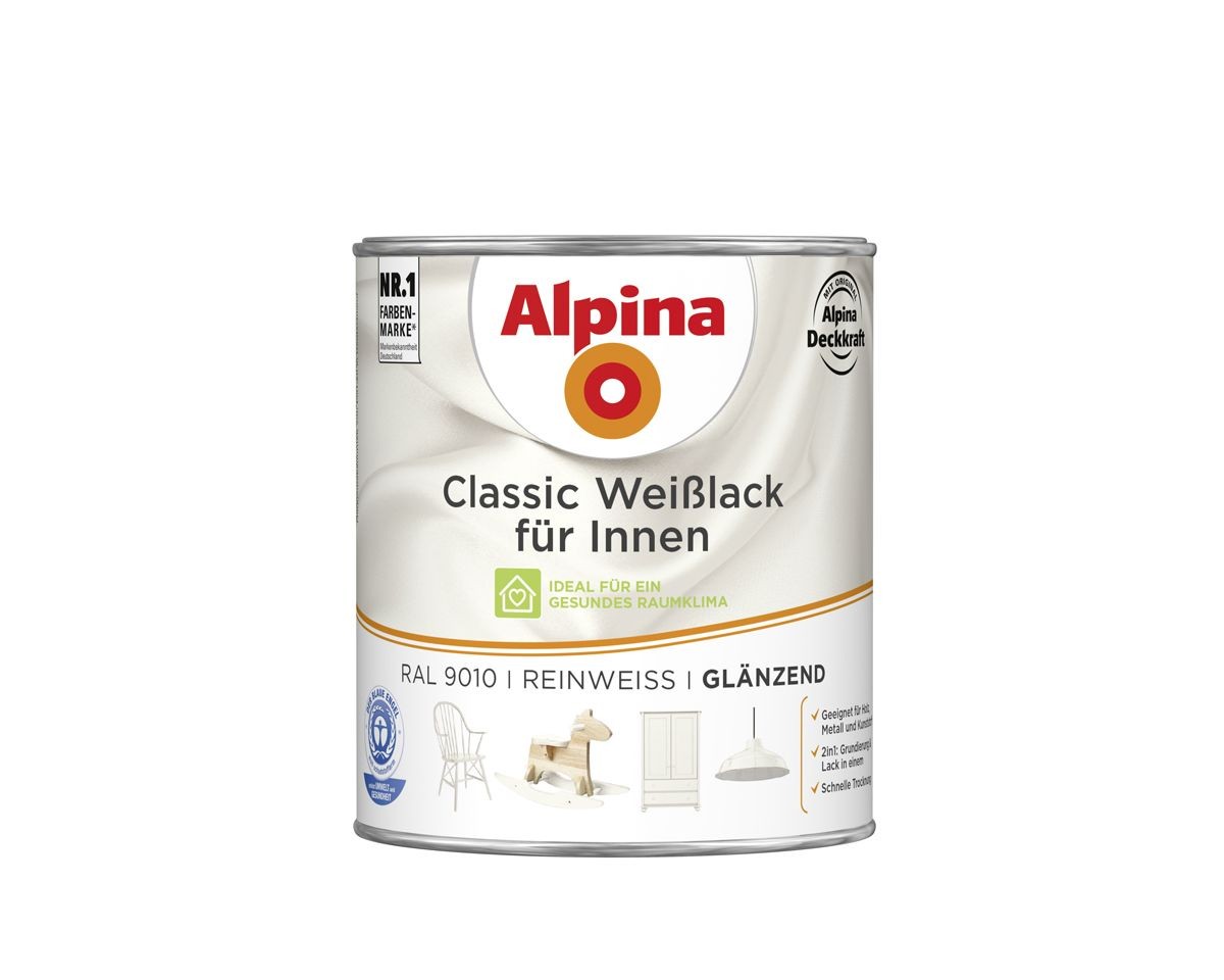 Der Alpina Weißlack Classic für Innen bietet eine sehr gute Deckkraft und ist leicht verdünnbar, was ihn auch für das Spritzen geeignet macht.