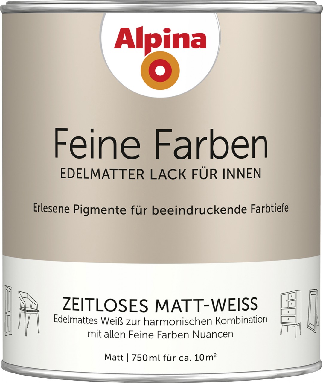 Der Alpina Feine Farben Lack in zeitlosem Matt-Weiß bietet eine gute Farbqualität und ermöglicht ein einfaches Auftragen. Die matte Oberfläche verleiht Ihren Möbeln oder Wänden einen modernen und zeitlosen Look, der zu vielen Einrichtungsstilen passt.