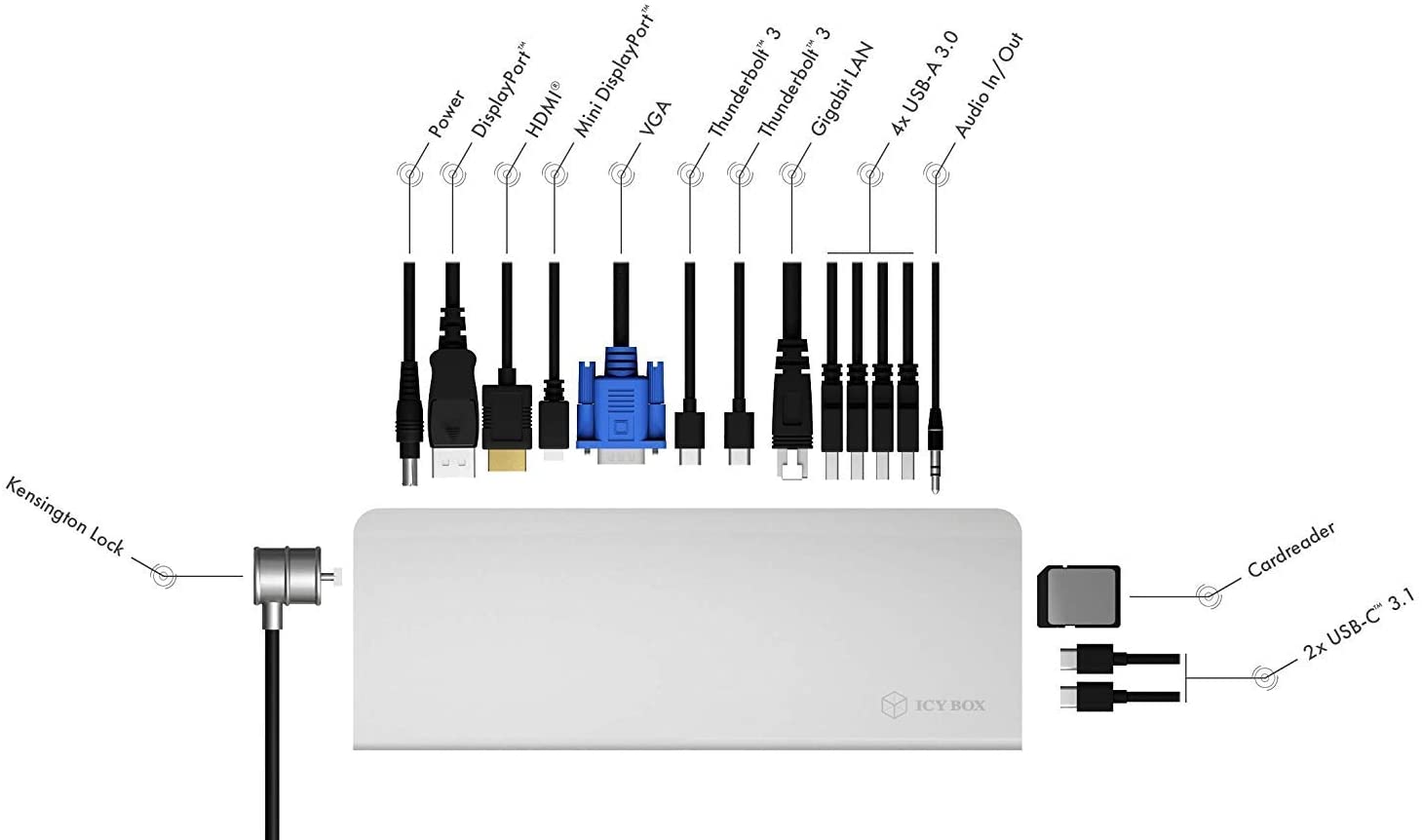 Thunderbolt wie bei der Dynabook Dockingstation ist durch ein Blitz-Symbol am Anschluss erkennbar. Rein optisch unterscheiden sich USB-TypC und Thunderbold nicht. Letzterer erreicht jedoch höhere Spitzengeschwindigkeiten. Ist kein Thunderbold-Anschluss am Notebook vorhanden, genügen auch normale USB-C-Eingänge wie bei der ICY BOX mobile. Diese überzeugt im Dockingstation-Test des Magazins Digital Home (01/2021) mit vielen Anschlüssen und kleiner Form punktet.