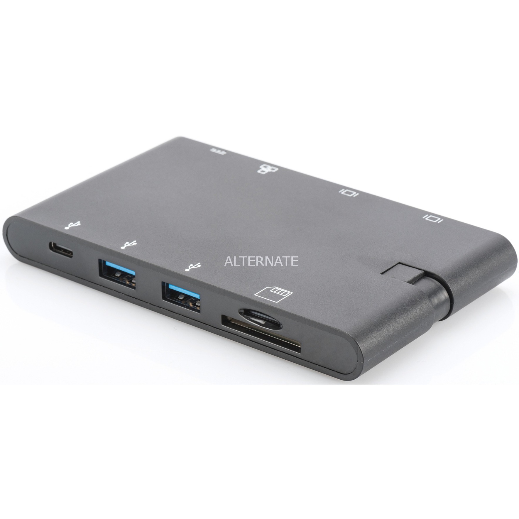 Die DIGITUS Multiport Docking-Station bietet neun Ports, die es ermöglichen einen Laptop mit einem zusätzlichen Monitor zu verbinden. Neben den VGA- und HDMI-Anschlüssen sind auch USB-C-, Ethernet-, Audio-, SD-Kartenlesegeräte sowie mehrere USB 3.0 Anschlüsse vorhanden.