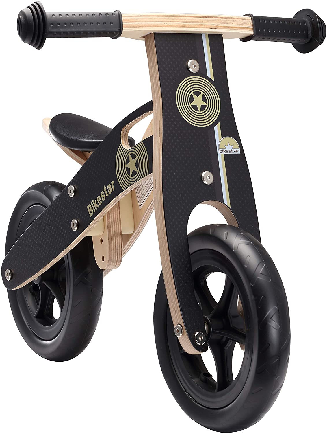 Kinderlaufrad Bikestar 10 Zoll - Natur Holz DAS LAUFRAD FÜR KLEINE ABENTEURER Bevor unsere kleinen Racker auf Fahrrädern durch die Gegend flitzen können, sollten sie zuvor ein Gefühl davon bekommen, wie es ist auf Rädern unterwegs zu sein. Die praktischen Laufräder von Bikestar helfen dabei genau dieses Gefühl zu vermitteln. Das Bikestar Laufrad hilft auf spielerische Art und Weise dabei den Gleichgewichtssinn zu stärken, was für spätere Fahrten auf einem richtigen Farhrrad unerlässlich ist. Das Bikestar Laufrad besteht aus einem hochstabilen Holzrahmen mit schlagfester Lackierung und ist damit besonders langlebig und unempfindlich gegenüber Beschädigungen. Die Lenkung des Laufrads geht leicht von der Hand und kann auch mit geringen Kraftaufwand genutzt werden. Die am Laufrad angebrachte Lenkereinschlagsbegrenzung verhindert scharfe Kurven Manöver und hilft dabei die Stabilität des Laufrads aufrecht zu erhalten. Der Radsattel ist in der Höhe verstellbar und die extra breiten EVA-Komfortreifen sorgen für angenehmen und widerstandsfreien Fahrkomfort. Das Bikestar Kinderlaufrad ist in der 10 Zoll Variante für Kinder zwischen 2 und 4 Jahren geeignet. LAUFRAD DETAILS HÖHENVERSTELLBAR Der höhenverstellbare Sattel des Bikestar Laufrads sorgt für eine lange Nutzungsdauer. Mit dieser Höhenverstellbarkeit möchte Bikestar den Wachtumsschüben entgegenwirken. Wachstumsschübe kommen ohne jegliche Vorwarnung und können jederzeit einsetzen. Durch die Höhenverstellbarkeit ist die Laufrad Nutzung auch nach einem Wachstumsschub immer noch möglich. So hat Ihr kleiner Racker lange Freude an dem Laufrad und kann sich sorgenfrei auf das spätere Fahrradfahren vorbereiten. Der Sattel kann mit nur wenigen Handgriffen in der Höhe verstellt werden. EINSCHLAGSBEGRENZUNG Die besonders praktische Lenkereinschlagsbegrenzung sorgt für zusätzliche Sicherheit beim Fahren. Die Begrenzung sorgt dafür, dass Ihr Kind keine allzu scharfen Kurven fährt. Durch die Reduzierung des Kurvenwinkels wird die Stabilität erhöht, denn in scharfen Kurven kann es schnell mal passieren, dass man die Kontrolle über das Fahrzeug verliert und unsanft auf dem Boden landet. Diese Begrenzung ist für Fahranfänger besonders wichtig, da ungeübte Fahrer dazu tendieren die eigenen Fähigkeiten zu überschätzen. Die Lenkereinschlagsbegrenzung erhöht darüber hinaus auch noch die Stabilität des Laufrads während des Stehens. EVA-BEREIFUNG Die EVA-Bereifung der Bikestar Laufräder mag auf den ersten Blick etwas deplatziert wirken, da man möglicherweise mit Luftreifen gerechnet hat. Allerdings wurden die EVA-Reifen aus gutem Grund bei den Bikestar Laufrädern verbaut. Denn EVA-Reifen zeichnen sich durch ihre große Stabilität und Widerstandsfähigkeit aus. Ein EVA-Reifen kann im Gegensatz zu Luftreifen keinen Platten bekommen. Auch das ständige Aufpumpen der Reifen entfällt. EVA-Reifen sind kaum kaputt zu kriegen und eignen sich dank der glatten Oberfläche auch ideal dazu, um in den eigenen vier Wänden benutzt werden zu können. Die glatte Oberfläche der EVA-Reifen schützt dabei den Bodenbelag Ihrer Wohnung und reduziert den Widerstand beim fahren. • TECHNISCHE EIGENSCHAFTEN • Produktgewicht: ca. 1,9 kg • Produktmaße (Länge x Höhe vorne x Höhe hinten): 83 x 45 x 29-36cm • Geeignet ab 2 Jahren • Empfohlene Körpergröße: Ab 85cm • Empfohlene Schrittlänge: 28-39cm • LIEFERUMFANG • Kinderlaufrad Holz Gestell • Giftfreie Sicherheitslenkgriffe • Extra breite EVA-Reifen (10 Zoll) • Höhenverstellbarer Laufradsattel Achtung! Benutzung nur unter unmittelbarer Aufsicht von Erwachsenen. Achtung! Mit Schutzausrüstung zu benutzen. Nicht im Straßenverkehr zu verwenden.