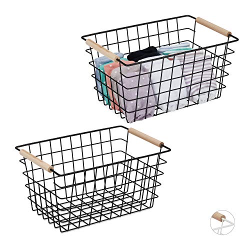 Relaxdays 2 x DrahtkorbHolzgriffe, rechteckig, Gitter Design, Kleidung, Accessoires, Metallkorb, HBT: 16x31x21 cm, schwarz