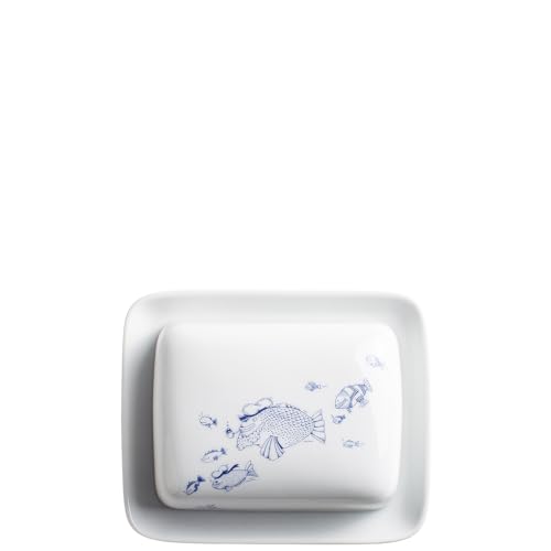 • Die KAHLA AHOI Marie Butterdose präsentiert sich in einem eckigen Design mit einem maritimen Fischschwarm-Muster auf Porzellan