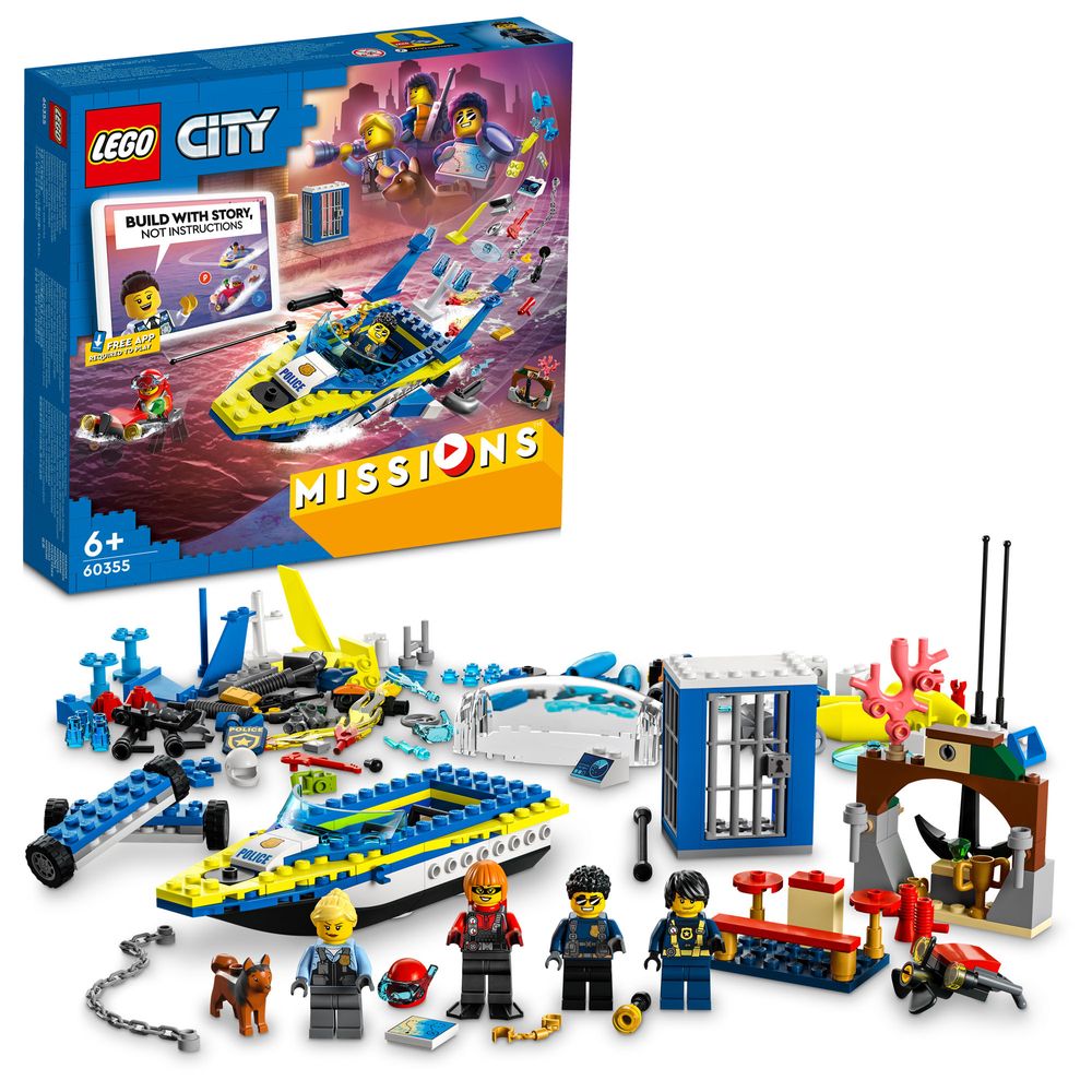Biete deinem Kind ein interaktives Spielerlebnis mit digitalen Detektivmissionen, bei denen dein Kind die Hauptrolle spielt und echte LEGO® Steine benutzt, um Bauherausforderungen zu meistern und so die Missionen auf dem Bildschirm erfolgreich abzuschließen. Das LEGO City Spielset „Detektivmissionen der Wasserpolizei“ (60355) beinhaltet ein cooles Spielzeug-Schnellboot für spannende Einsätze, eine Zelle für die Ganoven, den beliebten Polizisten Duke DeTain aus der TV-Serie LEGO City – Abenteuerund 3 weitere tolle Minifiguren. **Lade dir die kostenlose App herunter** Für das LEGO City Spielset „Detektivmissionen der Wasserpolizei“ für Kinder ab 6 Jahren wird ein Smartphone oder Tablet benötigt, auf dem die kostenlose LEGO Building Instructions App installiert ist. **Kinder lernen ganz spielerisch** Die Spielsets aus der Reihe LEGO City Missions machen Kinder ab 6 Jahren zu den Helden des jeweiligen Abenteuers. Dein Kind entwickelt kreative Fähigkeiten und lernt, Probleme zu lösen, wenn es mit beliebten TV-Helden interagiert und ohne Bauanleitung die Bauherausforderungen meistert, um die Lage zu retten! - Digitale Abenteuergeschichten: Biete deinem Kind mit dem LEGO® City Spielset „Detektivmissionen der Wasserpolizei“ (60355) ein cooles interaktives Spielerlebnis - Inhalt der Box: Alles, was Kinder brauchen, um ein Schnellboot für ihre Missionen zu bauen und die Bauherausforderungen ohne Anleitung zu meistern, sowie 4 Minifiguren, unter anderem den LEGO® City TV-Helden Duke DeTain - Interaktives LEGO® City Spielerlebnis für Kinder: Dein Kind spielt die Hauptrolle in digitalen Abenteuern und benutzt LEGO Bausteine, um die Detektivmissionen auf dem Bildschirm erfolgreich abzuschließen - Tolles Geschenk: Das interaktive LEGO® City Spielset „Detektivmissionen der Wasserpolizei“ eignet sich als Geburtstags- oder Überraschungsgeschenk für Kinder ab 6 Jahren, die cooles Spielzeug und Videospiele lieben - Abmessungen des Hauptmodells: Das fertige Schnellboot für die Detektivmissionen ist 4 cm hoch, 16 cm lang und 6 cm breit - Jede Menge Minifiguren-Zubehör für spannende Missionen: Taucherausrüstung, Lupe, Schwimmweste, Funkgerät, Fernglas, Handschellen, Kamera und ein Schatz - Bauspaß ohne Anleitung: Kinder benutzen LEGO® Steine und ihre eigene Kreativität, um die Bauherausforderungen auf dem Bildschirm zu meistern und die Lage zu retten - App-gestütztes Spielerlebnis: Die Spielsets der Reihe LEGO® City Missions erfordern ein Smartphone oder Tablet mit der LEGO Building Instructions App - Garantierte Qualität: Alle LEGO® Elemente entsprechen schon seit 1958 strengen Branchenstandards, damit sie einheitlich und kompatibel sind und großen Bauspaß bieten - Sicherheit steht an erster Stelle: LEGO® Elemente werden Fall-, Hitze-, Druck- und Torsionstests unterzogen und analysiert, damit sie strengen globalen Sicherheitsstandards entsprechen