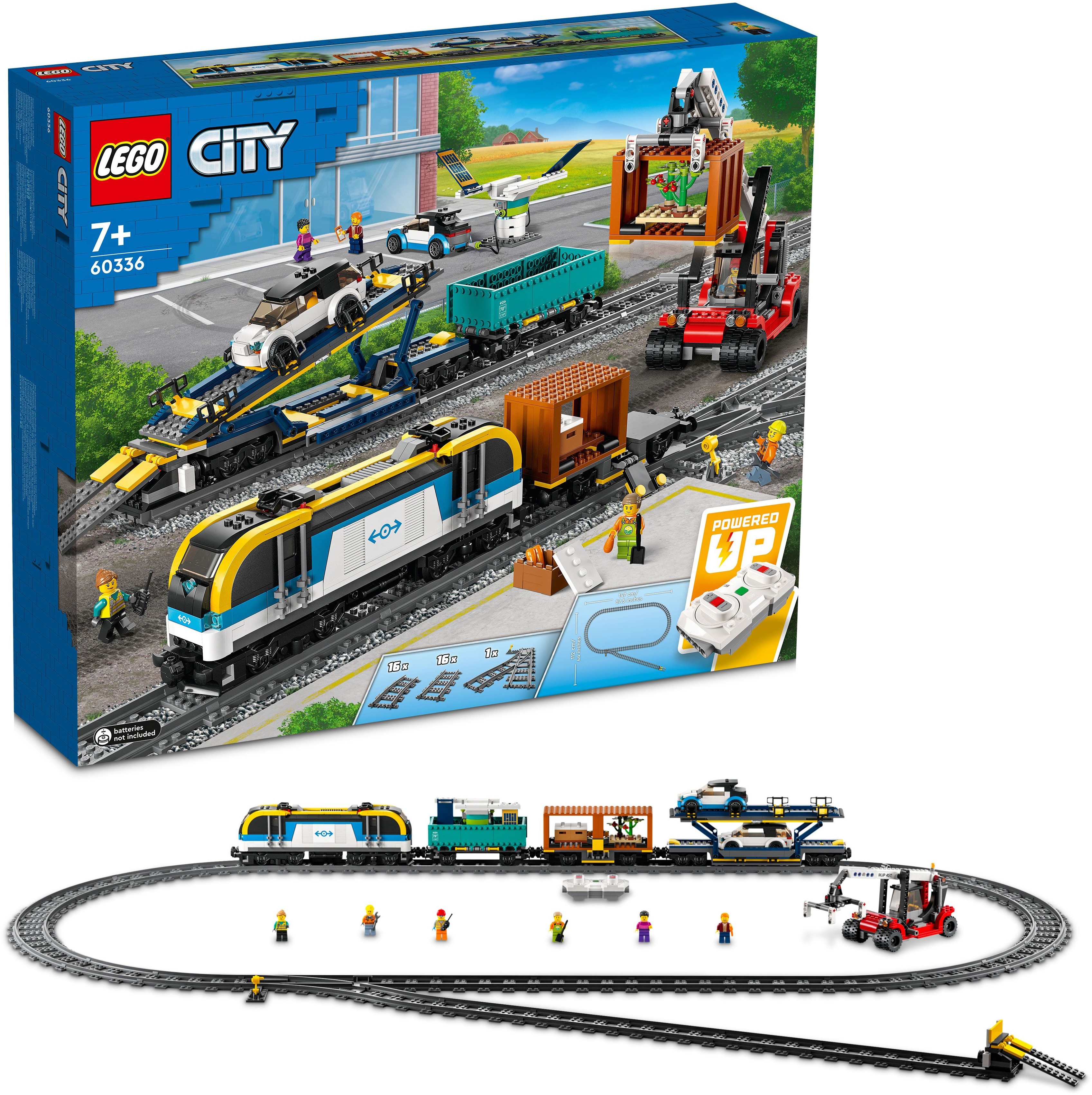 Was für ein grandioses Geschenk für Kinder und Eisenbahnfans! Der ferngesteuerte LEGO® City Güterzug (60336) verfügt über jede Menge authentische Funktionen. Das Set beinhaltet eine Lok mit LEGO Powered Up Technologie, einen Flachwagen mit 2 Containern, einen offenen Wagen, einen Autotransportwagen mit 2 Ladedecks sowie 33 Schienensegmente. Außerdem laden ein Greifstapler, 2 Elektroautos und 6 Minifiguren zu endlosen Eisenbahnabenteuern ein. **Tolles Set für Kinder und Eisenbahnfans** Diesem fantastischen Bau- und Spielset liegen einfache Bauanleitungen zu jedem Modell bei, damit Kinder ab 7 Jahren den Güterzug selbstständig bauen können. Das Set bietet aber auch ein tolles gemeinsames Bau- und Spielerlebnis mit Eltern und Geschwistern. **Cooles Kinderspielzeug – und noch viel mehr** LEGO City Spielsets lassen Kinder spannende Abenteuer mit realistischen Fahrzeugen, detailreichen Bauwerken und Konstruktionen und faszinierenden Figuren darstellen. Wenn Kinder Geschichten und Situationen nachspielen, die ihren Alltag widerspiegeln, lernen sie viel über ihre Umwelt. - Premium-Spielzeugeisenbahn: Das LEGO® City Spielset „Güterzug“ (60336) beinhaltet jede Menge Funktionen für unzählige Eisenbahnabenteuer - Inhalt der Box: Lok, Flachwagen, offener Wagen, Autotransportwagen, 2 Elektroautos, Ladestation, 2 Frachtcontainer, Greifstapler, Bahnsteig, 33 Schienensegmente und 6 Minifiguren - Coole Details und Funktionen: Die Lokomotive lässt sich mit der beiliegenden Fernsteuerung oder per Smartphone/Tablet mit der LEGO® Powered Up App bedienen - Geschenk für jeden Anlass: Dieses LEGO® City Eisenbahnspielset eignet sich als Geburtstags-, Weihnachts- oder Überraschungsgeschenk für Kinder und Eisenbahnfans ab 7 Jahren - Abmessungen: Der fertige LEGO® City Güterzug ist 9 cm hoch, 90 cm lang und 6 cm breit - Cooles Minifiguren-Zubehör: Schraubenzieher, Schaufel, Funkgerät und Telefon sowie Obst und Gemüse - Bau- und Spielset für Kinder ab 7 Jahren: In dem LEGO® City Spielset findest du auch einfache Bauanleitungen zu jedem Modell - 33 Schienensegmente: Zum LEGO® City Güterzug gehören auch jeweils 16 gekrümmte und 16 gerade Schienensegmente sowie eine Weiche - Garantierte Qualität: Jedes LEGO® Element entspricht strengen Branchenstandards, damit es einheitlich und kompatibel ist und großen Bauspaß bietet - Sicherheit steht an erster Stelle: LEGO® Elemente werden Fall-, Hitze-, Druck- und Torsionstests unterzogen und analysiert, damit sie strengen globalen Sicherheitsstandards entsprechen
