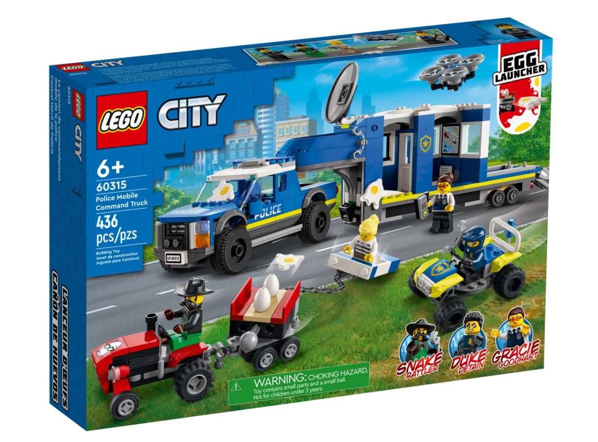 Mit dem LEGO® City Spielset „Mobile Polizei-Einsatzzentrale“ (60315) können Kinder eigene Geschichten aus der TV-Serie „LEGO City – Abenteuer“ darstellen. Das Set beinhaltet faszinierende Details, starke Funktionen und coole Fahrzeuge wie den Polizei-Pickup mit Anhänger, der ein Gefängnis, eine Drohne und ein Quad transportiert. Das Traktorgespann der Ganoven verfügt über einen Eierwerfer. Jetzt fehlen nur noch die Minifiguren Duke DeTain, Gracie Goodhart und Snake Rattler – und schon kann der Spaß beginnen! Für Kinder ab 6 Jahren. Dem LEGO Bauset liegt eine gedruckte Schritt-für-Schritt-Anleitung bei. In der kostenlosen LEGO Building Instructions App für Smartphones und Tablets ist außerdem eine interaktive Bauanleitung verfügbar. Die intuitiven Dreh- und Vergrößerungsfunktionen lassen Kinder digitale Ansichten der Modelle aus jedem Winkel betrachten. Die faszinierende LEGO City Welt Die LEGO City Spielsets bieten ein spannendes Bau- und Spielerlebnis. Detailreiche Gebäude, realistische Fahrzeuge und lustige Figuren laden zu unzähligen fantasievollen Rollenspielen ein. - LEGO® City Polizei-Spielset zur TV-Serie: Das LEGO City Spielset „Mobile Polizei-Einsatzzentrale“ (60315) beinhaltet jede Menge inspirierende Elemente für Kinder und Fans der TV-Serie „LEGO City – Abenteuer“ - Inhalt des Sets: Alles, was Kinder brauchen, um einen Polizei-Pickup, einen Anhänger mit Gefängnis, Drohne und Quad und ein Traktorgespann zu bauen. 3 der 4 Minifiguren sind Charaktere aus der LEGO® City TV-Serie - Details und Funktionen: Kinder können vom Traktorgespann Eier verschießen, das Gefängnis aufbrechen und das Quad lenken, indem sie es in die gewünschte Richtung neigen - Geschenk für jeden Anlass: Dieses LEGO® City Polizei-Spielset eignet sich als Geburtstags-, Weihnachts- oder Überraschungsgeschenk für Kinder und Fans der TV-Serie „LEGO City – Abenteuer“ ab 6 Jahren - Detailgetreue Modelle zum Spielen und Ausstellen: Der fertige Polizei-Pickup ist 6 cm hoch, 16 cm lang und 6 cm breit - LEGO® Minifiguren-Zubehör: Die Fernsteuerung für die Drohne, die Handschellen und die Eier-Elemente aus diesem Polizei-Spielset lassen Kinder fantasievoll spielen - Mit interaktiver Bauanleitung: In der LEGO® Building Instructions App für Smartphones und Tablets sind Funktionen zum Drehen, Vergrößern und näheren Betrachten der digitalen Modellansichten verfügbar - Entwicklungsförderndes Spielzeug: Beim Spielen entwickeln Kinder Selbstvertrauen, Kreativität und weitere wichtige Fähigkeiten - Qualität hat Vorrang: Alle LEGO® Elemente entsprechen schon seit 1958 strengen Branchenstandards, damit sie einheitlich und kompatibel sind und großen Bauspaß bieten - Sicherheit steht an erster Stelle: LEGO® Steine und Teile werden Fall-, Hitze-, Druck- und Torsionstests unterzogen und analysiert, damit sie strikten globalen Sicherheitsstandards entsprechen