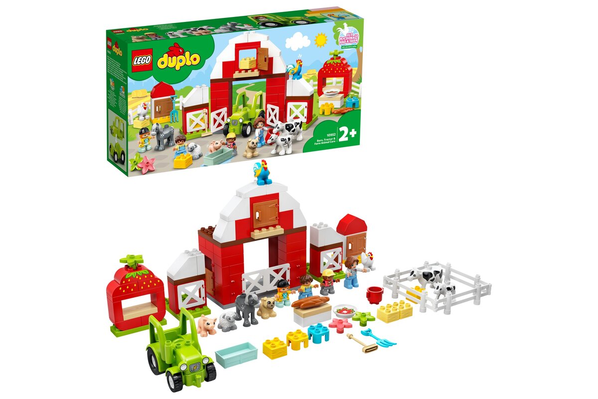 Das **LEGO® DUPLO® Set „Scheune, Traktor und Tierpflege“** (10952) lässt Kleinkinder spielerisch lernen. Der witzige Bauernhof ist das perfekte entwicklungsfördernde Spielzeug für Kleinkinder, die Tiere oder Traktoren lieben.Spielzeug-Bauernhof für KleinkinderDer LEGO® DUPLO® Bauernhof lädt zum Spielen mit den Gebäuden und dem Traktor ein. Kinder können verschiedene Tiere (Pony, Schwein, Hund, Schaf, Kühe, Hahn und Henne) versorgen und dabei feinmotorische Fähigkeiten und sozial-emotionale Kompetenz entwickeln.Entwicklungsförderndes Spielzeug für KleinkinderMit LEGO DUPLO Spielzeug lernen Kinder ganz spielerisch. DUPLO Spielsets lassen Eltern und Kleinkinder miteinander spielen und wichtige Entwicklungsschritte gemeinsam erleben. - Das LEGO® DUPLO® Spielset „Scheune, Traktor und Tierpflege“ (10952) bietet Kleinkindern, die Tiere und landwirtschaftliche Fahrzeuge lieben, viele Spiel- und Lernmöglichkeiten. - Beinhaltet einen Traktor, diverse Tiere (Schwein, Schaf, Pferd, Hund, Henne, Hahn und 2 Kühe), 4 LEGO® DUPLO® Figuren, eine baubare Scheune, einen Heuballen und jede Menge cooles Zubehör. - Beim Füttern der Tiere und beim Reiten entwickeln Kinder Fantasie, feinmotorische Fähigkeiten und sozial-emotionale Kompetenz. - Ein fantastisches Set für kleine Landwirte ab 2 Jahren und ein cooles Geschenk zu jedem Anlass für Tierfreunde, Traktorfans und neugierige Kinder. - Die Scheune ist 23 cm hoch, 20 cm breit und 11 cm tief. Das Spielset lässt sich vielseitig anordnen und mit anderen LEGO® DUPLO® Bauernhof-Spielzeugen kombinieren. - Die Bauanleitung beinhaltet eine lustige Bildergeschichte mit Modellen aus dem Set. Das Vergnügen beschränkt sich also nicht nur auf kreatives Bauen und fantasievolles Spielen. - Alle LEGO® DUPLO® Spielsets enthalten kindgerechte entwicklungsfördernde Funktionen, die Eltern und Kinder miteinander spielen lassen. - LEGO® DUPLO® Spielsets erfüllen bereits seit 1969 die strengen Qualitätsstandards der Branche, damit kleine Finger die Elemente leicht greifen, zusammenstecken und wieder trennen können. - LEGO® DUPLO® Steine und Teile werden Fall-, Hitze-, Druck- und Torsionstests unterzogen und gründlich analysiert, damit sie den hohen Standards für Kindersicherheit genügen. Achtung! Nicht für Kinder unter 36 Monaten geeignet. Enthält verschluckbare Kleinteile. Erstickungsgefahr.
