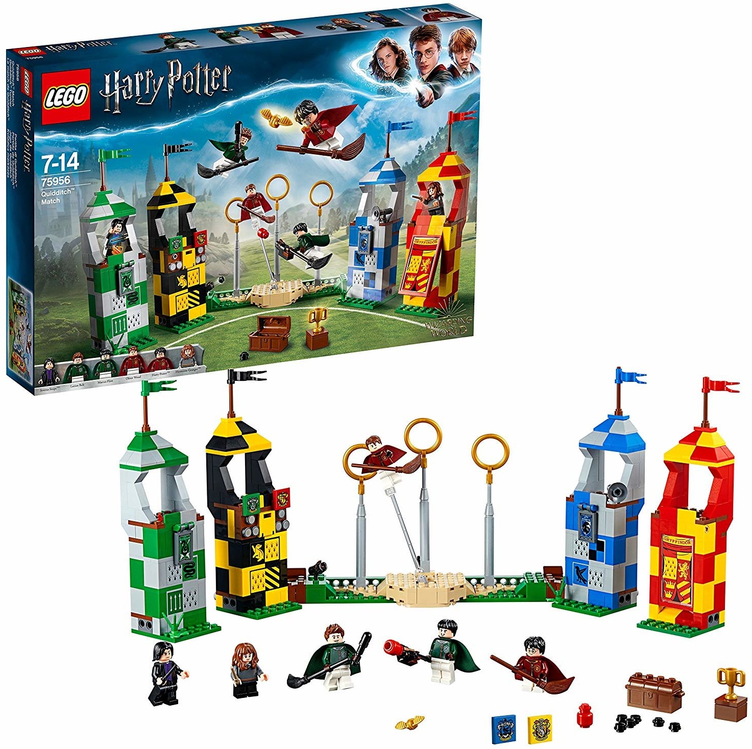 | Ausstattung | 6 Minifiguren: Harry Potter, Hermine Granger, Severus Snape, Oliver Wood, Lucian Bole und Marcus Flint; einen Gryffindor-Hausturm, einen Slytherin-Hausturm, einen Ravenclaw-Hausturm, einen Hufflepuff-Hausturm, eine Grundplatte mit 3 Torstangen mit Ringen, beweglichem Hüter und einem Klatscher-Shooter; Zubehör: eine Truhe, 2 Zauberstäbe, 4 Besen, einen Quaffel, einen goldenen Schnatz, einen Schläger, 2 Klatscher, einen Pokal, ein Megafon und eine Anzeigetafel |