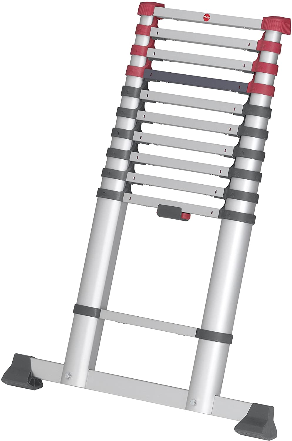 Die Hailo FlexLine ist eine kompakte und leichte Teleskopleiter aus Aluminium mit einem patentierten Ausziehmechanismus und Einklemmschutz. Sie ist in drei unterschiedlichen Längen erhältlich und lässt sich platzsparend verstauen. Die Leiter ist stabil und sicher, mit breiten Alu Füßen und Anzeigen an jeder Sprosse. Die Verarbeitung ist hochwertig, aber der Preis liegt am oberen Ende der Angebote.