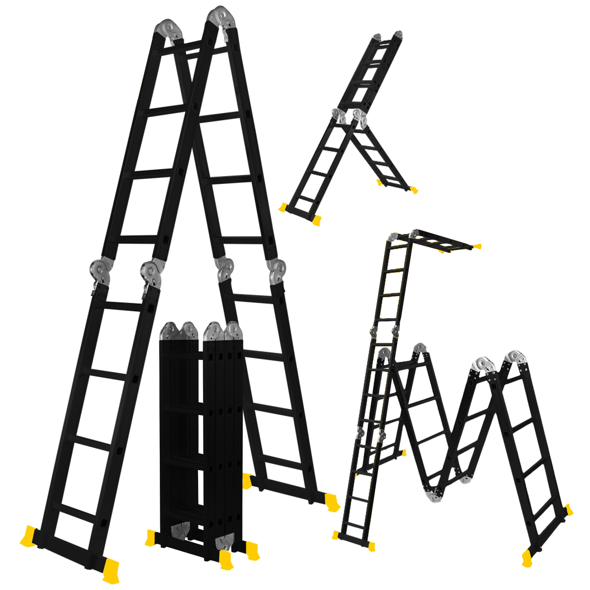 Die Craftfull Mehrzweckleiter CF-104A 6in1 Alu Multifunktionsleiter Gelenkleiter (4.7 Meter Black Edition 4x4 Sprossen) ist eine praktische und vielseitige Leiter, die sich in sechs verschiedenen Funktionen nutzen lässt. Sie kann als Anlege-, Schiebe-, Steh- oder auch Doppelleiter verwendet werden sowie als Arbeitsbühne oder Treppengeländer. Die Leiter ist aus robustem Aluminium gefertigt und lässt sich schnell zusammenbauen.