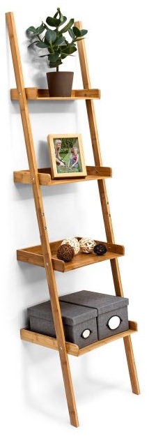 Sie wollen mehr Ordnung in Ihrem Arbeitszimmer? Mit diesem Leiterregal haben Sie eine dekorative Lösung gefunden. In seiner modernen Optik passt sich das 4-stufige Wandlehnregal gut in die Umgebung ein. Der natürliche Bambus eignet sich besonders für feuchte Räume, sodass das Leiterregal auch als Badregal genutzt werden kann. Die 4 Böden des Regals verjüngen sich nach oben und passen sich mit ihrer natürlichen Maserung in jeden Raum ein. Schmale Leisten an Seiten und Rückseiten der Fächer verhindern, dass abgestellte Gegenstände herunter fallen können. Das 4-stufige Leiterregal verfügt über einen sicheren Stand und bietet dekorativen Stauraum für nahezu jedes Zimmer. **Details zum Leiterregal** • Abmessungen H x B x T: ca. 176 x 44 x 37 cm • 4 Ablagen mit 16, 23, 30 und 37 cm Tiefe • Gewicht: ca. 4,5 kg • Material: Bambus • Belastbarkeit der einzelnen Ebenen: ca. 10 kg Dekoratives Regal für jeden Raum • Modernes Leiterregal • Aus natürlichem Bambus gefertigt • Auch für feuchte Räume gut geeignet • 4 Etagen für viel Stauraum • Einfache und schnelle Montage **Lieferumfang** • 2 Seitenteile • 4 Ablageflächen • Montagematerial • Aufbauanleitung • Dekoartikel nicht im Lieferumfang enthalten (EAN: 4052025191696)