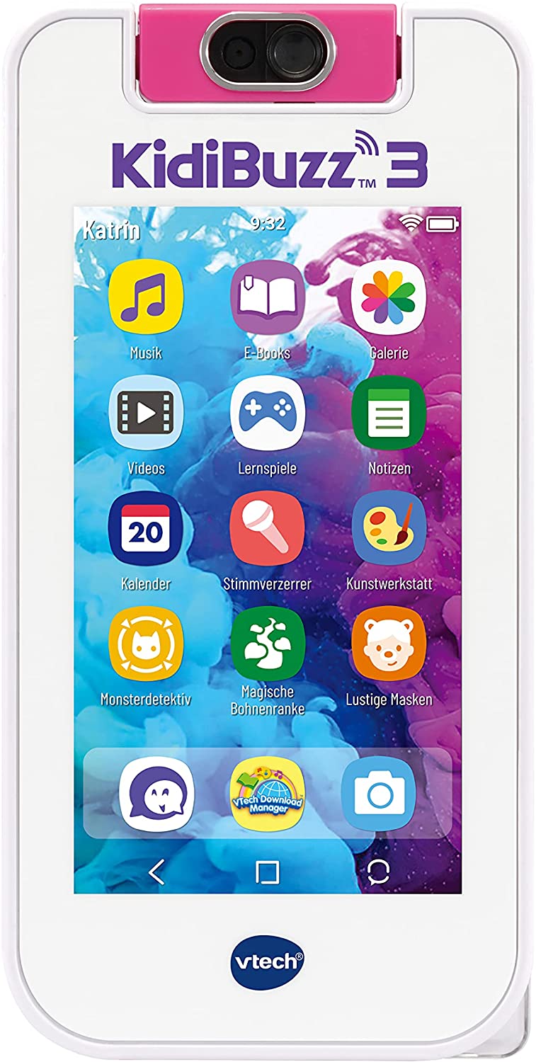 Weitere Informationen zum Kidi Buzz 3: Lieferumfang: 1 x Kidi Buzz 3 Farbe: pink/weiß Schneller Quad-Core Prozessor auf Android-Basis (Android 10, 32-bit) 5" LCD Farb-Multi-Touchscreen (1280 x 720 Pixel) 180 Grad drehbare Kamera (5 MP, Fotos auf 10 MP extrapolierbar), integriertes Makroobjektiv für scharfe Aufnahmen von Bildern und Videos mit geringem Aufnahmeabstand zum Objekt 19 Apps vorinstalliert (z. B. Musik, Lernspiele, E-Books, Kalender und Notizen sowie ein Spiel mit Augmented Reality) Tolle 3D Bildschirmhintergründe WLAN-Funktionen: Kidi Com Chat Nachrichten-App für Kinder, in der auch Videos verschickt werden können Verbesserter, kindersicherer Webbrowser Kabelloser Download von Inhalten aus dem V Tech Download Manager möglich (über WLAN) - Mit Video zum Thema Datenschutz im Internet Mit Elternkontrolle-Bereich, Mikrofon zur Stimmaufnahme und Bewegungssensor 1 GB RAM 8 GB interner Speicher, Speicherplatz mit micro SD- Karte (nicht enthalten) auf bis zu 136 GB erweiterbar Kopfhöreranschluss (Kopfhörer sind nicht enthalten) USB-Anschluss Integrierter Lithium-Akku Inklusive USB-Ladekabel Altersempfehlung: 5-12 Jahre Hersteller: V Tech Hersteller-Artikelnummer: 80-541154 Achtung! Nicht geeignet für Kinder unter 3 Jahren. Erstickungsgefahr durch abbrechbare, verschluckbare Kleinteile.
