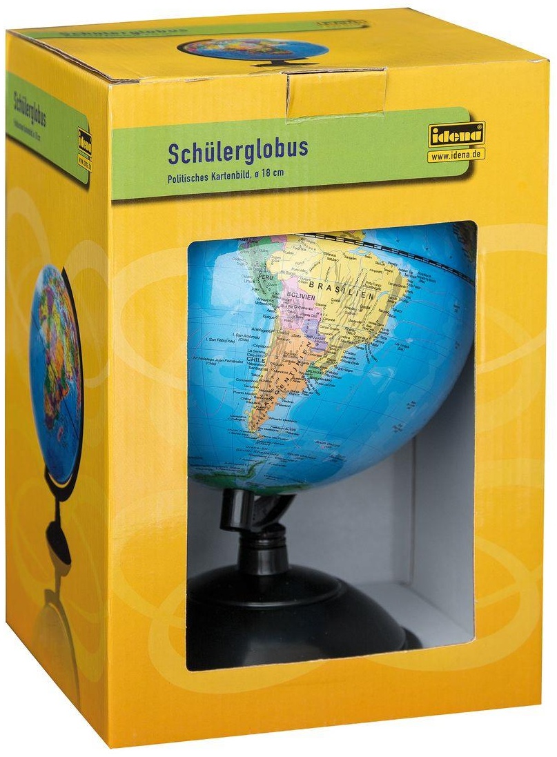 Idena 569906 - Schülerglobus 18cm politisches Kartenbild mit politischem Kartenbild ideal für die Schule und zum lernen Meer in blau dargestellt gut für das räumliche Vorstellungsvermögen Schülerglobus Mit einem Durchmesser von 18 cm ist der Idena Schülerglobus das ideale Lernmittel. Das politische Kartenbild verschafft einen Überblick über die Erde, Kontinente, Länder, Städte sowie Gebirge und Meere. Die Länder werden in verschiedenen Farben und das Meer in blau dargestellt. An der schwarzen Kunststoffhalterung befindet sich eine Skalierung der Breitengrade unseres Planeten. Ausgestattet ist der Schülerglobus mit einem sehr stabilen, schwarzen Kunststofffuß und einem schwarzen Meridian. Der Globus wird bereits aufgebaut geliefert und steht nicht nur als umfangreiche Informationsquelle zur Verfügung, sondern ist zugleich auch ein schönes Wohnaccessoire. Spaßiger Geografieunterricht: Ob als nützliche Lernhilfe für die Schule, zur Planung der nächsten Reise oder als schönes Wohnaccessoire - der Globus ist vielseitig einsetzbar. Farbgebung: Die politische Kartografie der Welt wird durch die unterschiedliche Farbgebung der einzelnen Staaten hervorgehoben. Leichtes Verstauen in der Schultasche: Der Schülerglobus wird komplett aufgebaut geliefert. Mit seinem Aufbaumaß von 27,2 x 18,4 x 18,2 cm (LxBxH) findet der Globus auch in der Schultasche Platz und kann zu Lerngruppen mitgenommen werden. Details: -Durchmesser: 18 cm -Kartenbild: Politisch -Aufbaumaß: 27,2 x 18,4 x 18,4cm -Achtung: Nicht geeignet für Kinder unter 3 Jahren. Benutzung unter Aufsicht von Erwachsenen