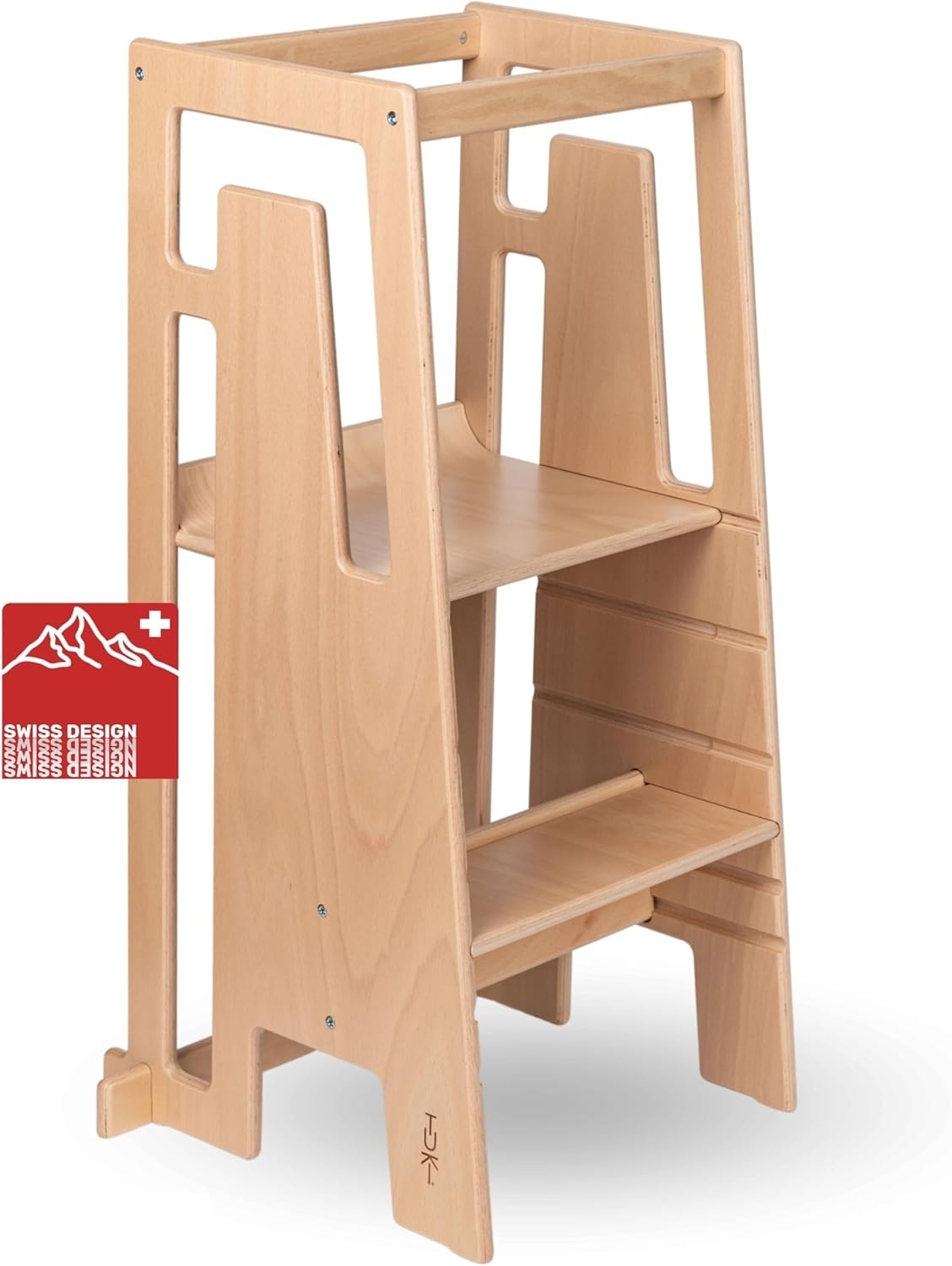Entdecke gemeinsam mit deinem kleinen Schatz die Welt • Höhenverstellbar (wächst von 1-8 Jahren mit) • Bis 100kg belastbar • Schweizer Design • Made in France • Nachhaltig von A-Z Der Tuki ermöglicht es Kleinkindern in der Küche mit den Eltern in der Pfanne zu rühren, am Küchentisch Guetzli auszustechen, in der Werkstatt zu Basteln oder im Badezimmer die Hände zu waschen. Kinder wollen die Welt auf eigene Faust entdecken. Tischplatten, Arbeitsflächen in der Küche oder deie Aussicht aus dem Fenster bleiben für sie lange Zeit unerreichbar. Der Tuki hebt Kleinkinder in jedem Haushalt auf die Handlungsebene und regt Fantasie, Kreativität und Leidenschaft an. Lange Lebensdauer Der intelligente Tuki ist höhenverstellbar in drei stufen und kann somit von Kindern bis mindestens 8 Jahren verwendet werden. Durch das Entfernen des hinteren oberen Balkens dient der Tuki als normaler Tritthocker und kann auch von Erwachsenen verwendet werden. Tuki - Der sichere Lernturm Der Tuki Lernturm ist komplett kippsicher. Dank der Höhenverstellbarkeit bleibt der Schwerpunkt tief. Zudem gibt der intelligente Fuss auf der Seite des Tukis zusätzliche Sicherheit. Der Tuki kann bis 100kg belastet werden und trägt somit auch erwachsene. Der Tuki ist vom TÜV amtlich geprüft. Von zwei Schweizer \"Jüngstunternehmern\" erfunden mimodo AG steht für junges Unternehmertum und viel Elan, die Welt ein bisschen besser zu machen. Genau genommen für Dominic Ill (20) und Simon Thut (21). Die beiden Jungunternehmer sind seit ihrer frühen Kindheit eng befreundet und haben schon früh beschlossen, zusammen ein Unternehmen aufzubauen. Tuki - von A - Z nachhaltig in Frankreich produziert Die Produktionsstätte in der Champagne verwendet PEFC zertifiziertes Holz aus der Umgebung. Die kurzen Anfahrtswege in der Produktion und der Beschaffung der Materialien tragen zur Nachhaltigkeit des Tukis bei. Auch die Verpackung ist nachhaltig. Produktinformationen • Empfohlenes Alter: 1-7 Jahre • Normen: DIN EN 14988:2017; anwendbare Pru¨fungenDIN EN 17191:2019; anwendbare Pru¨fungenDIN EN 14183:2004; 6.2: Senkrechte Belastung der Sprossen, Stufen und Plattformen • Material: Buche • Paketmaße: 94 x 44 x 7 cm • Gewicht: 10.5kg
