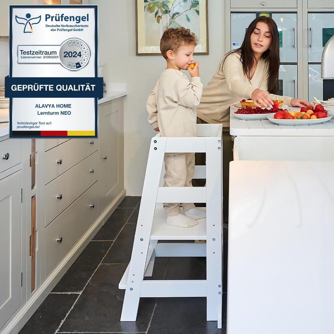 Der Kinder Lernturm NEO schafft eine sichere und anregende Umgebung für Ihr Kind, in der es die Welt entdecken und lernen kann. Von der Kochkunst bis zur Selbstständigkeit fördert dieser Lernturm die Entwicklung Ihres Kindes auf vielfältige Weise. Und mit seinem stilvollen Design wird er auch in Ihrem Zuhause zu einem Blickfang. 3-fach höhenverstellbar: Unser NEO Lernturm ist in drei verschiedenen höhenverstellbar, damit er perfekt auf das Alter und die Bedürfnisse Ihres Kindes abgestimmt werden kann. Von den ersten Schritten bis zum fünften Geburtstag – dieser Lernturm wächst mit Ihrem Kind mit. Hochwertiges Buchenholz: Hergestellt aus massivem Buchenholz aus nachhaltiger Forstwirtschaft, zeichnet sich der NEO Lernturm durch seine erstklassige Qualität und Nachhaltigkeit aus. Jedes Teil wird von Hand geformt und abgerundet, um maximale Sicherheit für Ihre Liebsten zu gewährleisten. Sichere Farben: Unsere verwendeten Farben sind nicht nur geruchsneutral, sondern auch nach DIN EN 71-3:2019 zertifiziert und somit absolut kindgerecht. Sie können sicher sein, dass Ihr Kind in einer gesunden und sicheren Umgebung aufwächst. Montessori-Inspiration: Der NEO Lernturm ist von der Montessori-Philosophie inspiriert und fördert spielerisches Lernen und die Selbstständigkeit Ihres Kindes. Ob beim Kochen, Backen oder einfach nur beim Händewaschen – Ihr Kind kann aktiv am Geschehen teilnehmen und seine Fähigkeiten entwickeln. Auf Augenhöhe: Mit dem Lernturm können Kinder jederzeit auf Augenhöhe sein. Sie können nicht nur zusehen, sondern auch tatkräftig mithelfen. Diese Interaktion fördert die kognitive Entwicklung und stärkt das Selbstbewusstsein der kleinen Entdecker. Langlebigkeit: Der NEO Lernturm kann mit wenigen Handgriffen in einen praktischen Tritthocker umgebaut werden, wenn Ihre Kinder älter werden. Dank seiner robusten Bauweise und des zusätzlichen Kippschutzes ist er äußerst stabil und sorgt für die Sicherheit Ihrer Liebsten. Vielseitiges Design: NEO Kinder Lernturm aus massivem Buchenholz mit zeitlosem Design, das sich in jede Raumgestaltung harmonisch einfügt und mit anderen Möbeln perfekt kombinierbar ist. Rausfallschutz: Der umlaufende Rausfallschutz bietet zusätzliche Sicherheit, sodass Sie sich keine Sorgen machen müssen, während Ihr Kind den Lernturm nutzt. Eigenschaften auf einen Blick: • NEO Kinder Lernturm aus massivem Buchenholz • Zeitloses Design, vielseitig einsetzbar und kombinierbar mit anderen Möbeln • Geruchsneutrale wasserbasierter Lackierung, zertifiziert nach DIN EN 71-3:2019 • 3-fache Höhenverstellbarkeit zur Anpassung an das Kindesalter • Geeignet für Kinder im Alter von 1-5 Jahren und bis zu 70 kg belastbar • Handgefertigt und abgerundete Kanten, für maximale Sicherheit • Hochwertiges Buchenholz aus nachhaltiger Forstwirtschaft • Montessori-inspiriert. Fördert spielerisches Lernen und Interaktion • Ermöglicht Kindern, bei alltäglichen Aufgaben auf Augenhöhe mitzumachen • Entwicklungsfördernd, hilft kleinen Entdeckern • Kann in einen Tritthocker umgebaut werden • Robuste Bauweise und zusätzlicher Kippschutz für zusätzliche Sicherheit • Verwandelt alltägliche Aufgaben in lehrreiche Erfahrungen • Ermöglicht Kindern, aktiv an Haushaltsaufgaben teil zu nehmen • Sichere Umgebung für Kinder, um ihre Welt zu erkunden und zu lernen • Mitwachsendes Design, bietet langfristige Nutzungsmöglichkeit • Responsible Forestry und FSC zertifiziert • Hergestellt nach DIN EN 716-1 und EN 716-2 • Einfache Montage und Pflege • Liebevolle Handwerkskunst • Kindgerechte Farbe • Geprüfte Qualität Produktdetails: • Marke: Alavya Home® • Farbe: Weiß • Gewicht: 8 kg • Material: Massivholz Buche • Abmessungen: 85 x 40 x 47 cm • Belastbarkeit: bis 70 Kg • Höhenverstellbare Trittstufen von 15 auf 19 und 22 cm • Höhenverstellbaren Trittfläche von 32 auf 39 und 45 cm. Die abgebildete Dekoration ist nicht im Lieferumfang enthalten!