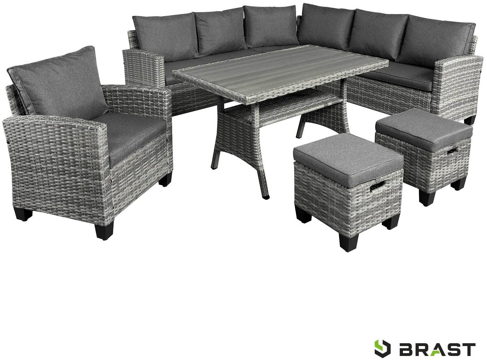 Sie möchten das gemeinsame Essen mit Freunden und der Familie am liebsten bei schönem Wetter gemütlich draußen im Garten oder auf der Terrasse genießen? Dann ist unsere BRAST Sitzgruppe HACIENDA genau das Richtige für Sie! Unsere TÜV geprüfte BRAST Polyrattan Essgrupppe hat so einiges zu bieten: - Wetterfestes und UV-beständiges Polyrattan - Stabiles und pulverbeschichtetes Metall-Gestell - Komfortable Maße der Armlehnen, Sitz- und Rückenhöhe - Besonders bequeme Sitz- und Rückenkissen **Beste Qualität:** Sicherheit und Qualität gehören zu den Hauptmerkmalen unserer Gartenmöbel: - TÜV-Zertifizierung: Die meisten unserer BRAST Essgruppen wurden von der akkreditierten Prüfstelle TÜV Süd getestet und mit dem Prüfzeichen "Geprüfte Sicherheit" ausgezeichnet - Testnote SEHR GUT 1,4 in der Oberklasse, vergeben durch das unabhängige Testmagazin „Heimwerker Praxis“ (Ausgabe 04/22) - Besonders langlebiges, wetterfestes und UV-beständiges Polyrattan Geflecht - Großer Tisch mit Polywood Oberfläche - Vom TÜV mit 25.000 Wiederholungen getestete Belastbarkeit pro Sitz von 160kg (unter 40°C) **Hochwertiges Polyrattan:** Sitzgruppen aus dem absoluten Trendmaterial für Outdoor Möbel: - Hochwertiges und erheblich teureres Rundrattan-Geflecht - Wesentlich natürlicher, eleganter und optisch kaum vom Naturrattan zu unterscheiden - Bedeutend schmalere Poly-Rattanbänder - Von ausgebildeten Weberinnen in Handarbeit geflochten **Stabiles Gestell:** Unsere Polyrattan Sitzgarnituren überzeugen durch ein durchdachtes Gestell: - Besonders stabiles und pulverbeschichtetes Metall-Gestell - Hohe Solidität und trotzdem leicht beim Transport **Besonderer Komfort:** Auf diesen Gartenmöbel Sets können Sie lange gemeinsam sitzen: - Armlehnen mit 8cm Breite - Sitzhöhe von 38cm (mit Kissen sogar 46cm!) - Rückenhöhe mit Kissen von 80cm ideal zum entspannten Zurücklehnen - Sofa-Rückenlehne der Krümmung der Wirbelsäule ergonomisch nachempfunden - Platz für 10 Personen **Bequeme Kissen:** Ein weiterer Vorteil der BRAST Polyrattan Outdoor Sitzgruppen sind unsere gemütlichen Kissen: - Hochwertiger und bestärkter Nahtbesatz - Wasserabweisend - 3-Schicht-Sandwich-System - Rückenkissen mit über 18cm Dicke **Ausgesprochen praktisch:** Um Komfort und Funktionalität zu vereinen, verfügen unsere Gartenmöbel über diese Features: - Tisch mit zusätzlicher Ablageebene auf halber Höhe - Höhenverstellbare Schraub-Ausgleichs-Standfüße bei Sofa, Sessel, Hocker und Couchtisch für leichten Ausgleich bei Boden-Unebenheiten oder Höhenunterschieden - inkl. wasserdichte Abdeckung für optimalen Schutz **Einfache Reinigung:** Die Reinigung unserer BRAST Polyrattan Garten Garnituren ist besonders einfach: - Polyrattan ist besonders unempfindlich, schmutzabweisend und leicht zu reinigen - Die Bezüge der Sitz- und Rückenkissen sind per Reißverschluss abnehmbar und waschbar **Technische Daten Polyrattan Garten Garnitur HACIENDA grau/anthrazit** - Geflecht-Material Polyrattan Polyethylen PE, vollständig recyclebar - Material Oberfläche Tisch: Polywood 13mm - Graues Rattan mit anthrazit Kissen - Pulverbeschichtetes Metallgestell - Sitz-Kissendicke 8cm - Rücken-Kissendicke 18cm - Bezugsstoff Sitz- und Rückenkissen 100% Polyester mit Reißverschluss - Breite Arm- und Rückenlehnen: 8cm - Höhe Rückenlehne: 74cm, mit Kissen 80cm - Sitzhöhe 38cm, mit Kissen 46cm - Tiefe 67cm, Sitztiefe 54cm - Sofa: Linker und rechter Flügel je 218cm - Sessel: Breite 76cm, Sitzbreite 60cm - Hocker: je 40 x 40 x 36 cm, mit Kissen 44cm Höhe - Tisch 128x74 cm, Höhe 69cm - Höhenverstellbare Standfüße für Sofa, Sessel, Hocker und Tisch - Belastbarkeit je Sitz bis 160kg (unter 40°C)