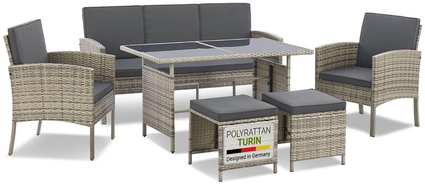 | Name | Juskys 'Turin' Outdoor Sitzgruppe für 7 Personen, Polyrattan, 120 x 70 cm, Grau |