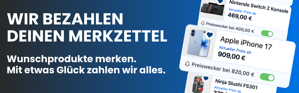 Wir losen zufällig einen Gewinner aus und kaufen die Produkte, die sich am Ende auf deinem Merkzettel befinden (bis 1.000 € Gesamtwert). Ist mehr auf der Liste, darfst du dir Produkte bis 1.000 € aussuchen.