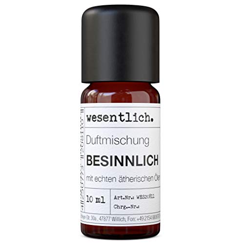 Das Duftöl 'besinnlich' von wesentlich. ist eine harmonische Mischung aus ätherischen Ölen, die eine festliche Weihnachtsstimmung erzeugt. Es kombiniert Aromen von Zimt, Nelken und Orangenschalen und ist äußerst ergiebig. Die Qualität des Öls ist hoch und es ist frei von künstlichen Zusätzen. Es eignet sich sowohl für Duftlampen als auch für die Herstellung von Duftkerzen, wobei die Dosierung beachtet werden sollte, um eine Überdosierung zu vermeiden.