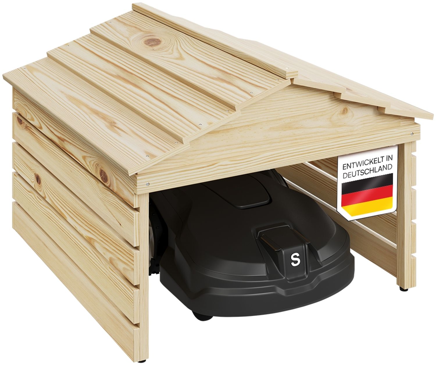 Die Mähroboter-Garage „Nembus“ schützt Ihren Mähroboter zuverlässig vor Regen, Sonneneinstrahlung und Schmutz. Gefertigt aus hochwertigem Kiefernholz mit transparenter Schutzfarbe, bleibt die natürliche Maserung des Holzes erhalten und verleiht der Garage eine dezente, stilvolle Optik. Dank der durchdachten Konstruktion bietet sie nicht nur einen sicheren Unterstand, sondern lässt sich auch einfach handhaben und pflegen. **Witterungsbeständig & langlebig – Kiefernholz mit Schutzlackierung** Das robuste Kiefernholz ist mit einer transparenten Lackierung versehen, die speziell für den Außenbereich entwickelt wurde. Sie bewahrt die natürliche Holzfarbe, schützt es jedoch zuverlässig vor UV-Strahlung, Feuchtigkeit und Witterungseinflüssen. Dadurch bleibt die Garage über lange Zeit stabil und pflegeleicht, ohne dass das Holz seinen natürlichen Charakter verliert. **Funktional & durchdacht – Ein sicherer Stellplatz für Ihren Mähroboter** Mit einer großzügigen Eingangsöffnung von **65x35 cm** bietet die Garage ausreichend Platz für verschiedene Mährobotermodelle. Die mitgelieferten Standfüße ermöglichen eine flexible Erhöhung auf bis zu **55 cm**, wodurch sich die Eingangshöhe auf **36,5 cm** anpassen lässt. Die Füße sorgen zudem für eine bessere Belüftung und verhindern direkten Bodenkontakt, was das Holz zusätzlich schützt. **Praktische Handhabung – Komfort für Pflege & Nutzung** Die Garage ist mit rostfreien Edelstahl-Schrauben ausgestattet, die für eine hohe Stabilität und Witterungsbeständigkeit sorgen. Ein **halbkreisförmiger Kabeldurchlass** auf der Rückseite ermöglicht eine einfache Kabelführung zur Ladestation. Zudem lässt sich das **Dach problemlos abnehmen**, sodass der Mähroboter jederzeit leicht zugänglich bleibt – sei es für eine Reinigung, Wartung oder das manuelle Starten. **Produktdetails:** - Material: Kiefernholz, behandelt für den Outdoor-Bereich - Farbe: Transparent (Dach & Korpus) - Produktmaße: 53,5H x 74,5B x 78,5L cm, Länge innen: 71 cm - Eingangsöffnung: 65B x 35H cm (mit Standfüßen 36,5H cm) - 4 Standfüße zum Schutz vor Feuchtigkeit, höhenverstellbar - Abnehmbares Dach für einfachen Zugang - Edelstahl-Schrauben für hohe Stabilität und Witterungsbeständigkeit - Kabeldurchlass auf der Rückseite für die Ladestation