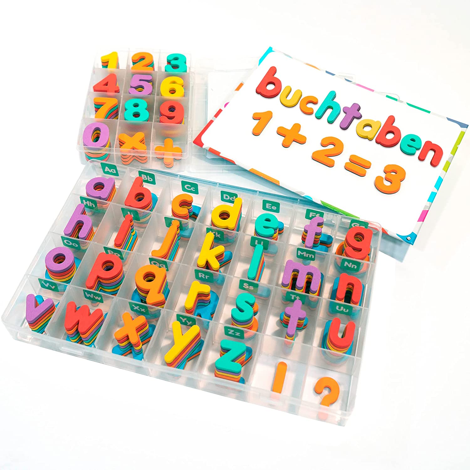 | Name | Magnetische Buchstaben und Zahlen für Kinder – Das komplette Set: 182 Buchstaben und 81 Zahlen sowie Symbole – Kühlschrankmagneten – Beinhaltet 2 Boxen, Magnettafel, Stifte und Löschschwamm |