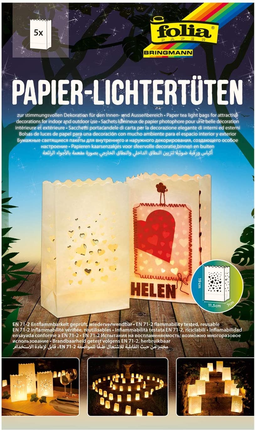 | Name | folia 11902 - Lichtertüten aus schwer entflammbarem Papier, Herzen, 5 Stück je ca. 19 x 11,5 x 7 cm groß, zum selbstgestalten, stimmungsvolle Tischdekoration, für Gartenpartys, Geburtstage, Hochzeiten |