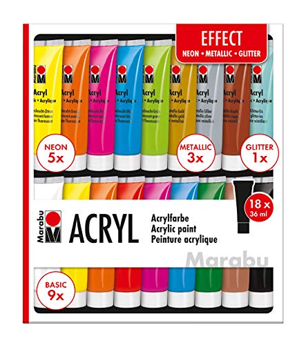 | Lieferumfang | 18 x 36 ml Acrylfarben (9 Basic, 5 Neon, 3 Metallic, 1 Glitter) |
