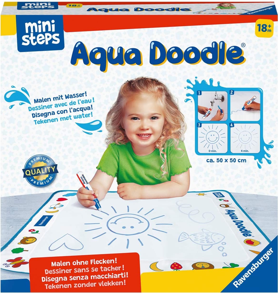 | Beschreibung | Erster Malspaß mit dem Ravensburger Malset Aqua Doodle Aqua Doodle von Ravensburger ist ideal zum ersten Malen für Kleinkinder ab 18 Monaten. Einfach Wasser in den Stift, schon malen Kinder nach Herzenslust auf der magischen Malmatte - garantiert fleckenfrei. Das Geheimnis: In Kontakt mit Wasser färbt sich die Matte blau. Trocknet das Wasser, verschwinden die Striche und das Malset ist bereit für ein neues Werk. Aqua Doodle von Ravensburger garantiert höchste Qualität in Funktion und Verarbeitung und steht für einen sicheren und langlebigen Malspaß. Packungsinhalt: 1 Malmatte (ca 50 x 50 cm), 1 Aqua Doodle®-Stift Maße der Verpackung: 26,5 x 26,5 x 5,5 cm Altersempfehlung: ab 18 Monate |