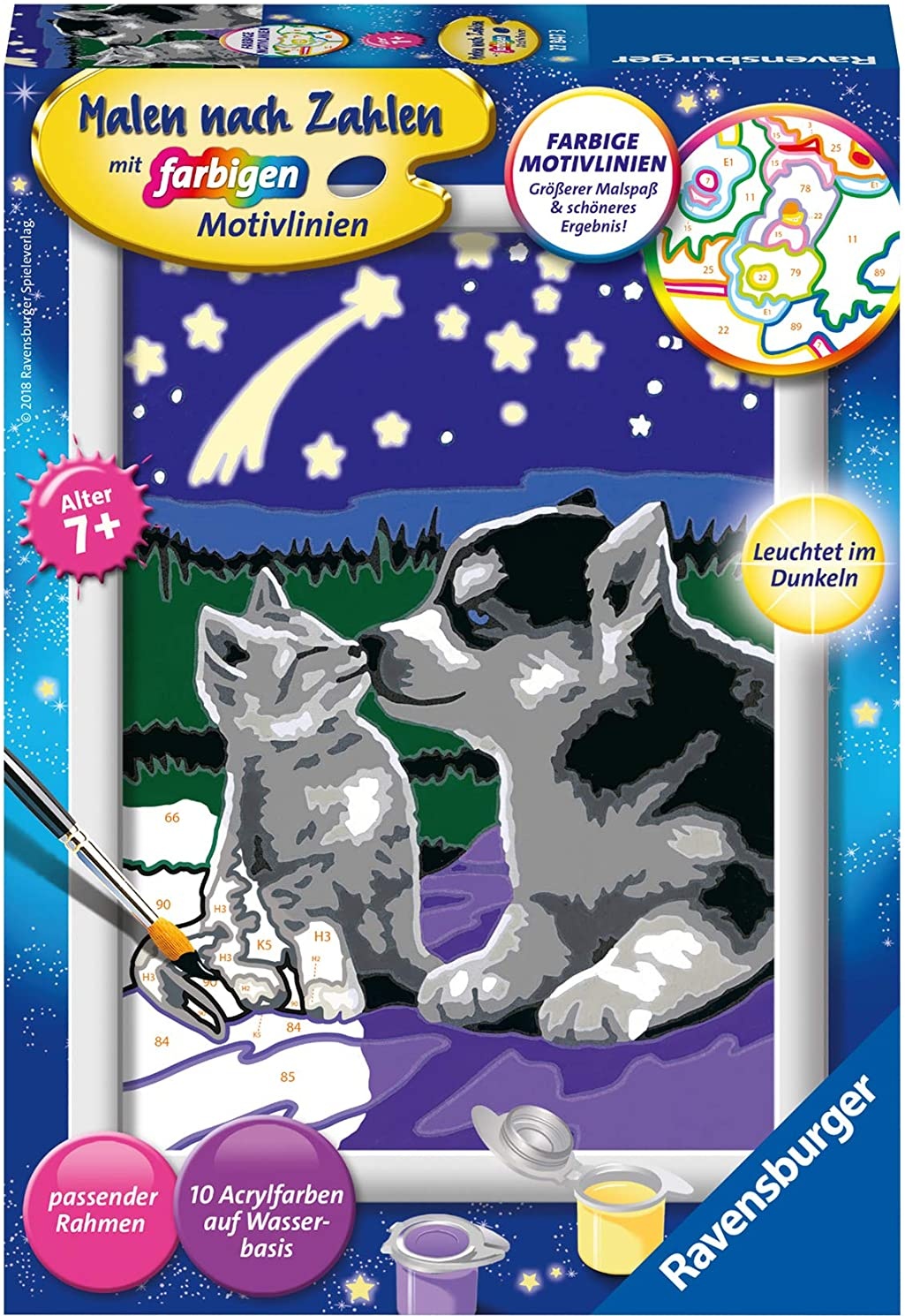 Farbige Motivlinien: Größerer Malspaß & schöneres Ergebnis mit dem Ravensburger Malset Malen nach Zahlen Hund und Katze Dank der farbigen Motivlinien, welche die Malfelder umranden, können die Kinder das ganze Motiv und die benötigten Farben schneller erkennen. Zudem hat der Pinsel eine gute Führung. So entsteht nach und nach ein perfektes Bild. Am Ende stehen Freude, Stolz und ein Erfolgserlebnis, das die Lust am Weitermalen weckt. Packungsinhalt: Dieses Komplettset enthält eine Maltafel (18 x 13 cm) mit Malfeldern in altersgerechter Größe, 10 Acrylfarben in wiederverschließbaren Näpfchen, einen Qualitätspinsel und einen passenden, hochwertigen Bilderrahmen. Anleitung und Vorlageblatt sind nützliche Helfer beim Malen. Die hochwertigen Acrylfarben trocknen schnell, sind auf Wasserbasis, geruchsneutral und benötigen keinen Pinselreiniger. Maße der Maltafel: ca. 18 x 13 cm Altersempfehlung: ab 7 Jahre Achtung! Nicht geeignet für Kinder unter 7 Jahren. Benutzung unter Aufsicht von Erwachsenen. Anweisung vor Gebrauch lesen, befolgen und nachschlagebereit halten. Die Farben enthalten Konservierungsstoffe: 2-bromo-2-nitropropane-1,3-diol, 3-iodo-2-propynyl butylcarbamate. Enthält Reaktionsgemisch aus 5-chloro-2-methyl-4-isothiazolin-3-one und 2-methyl-2H-isothiazol-3-one (3:1). Kann allergische Reaktionen hervorrufen.