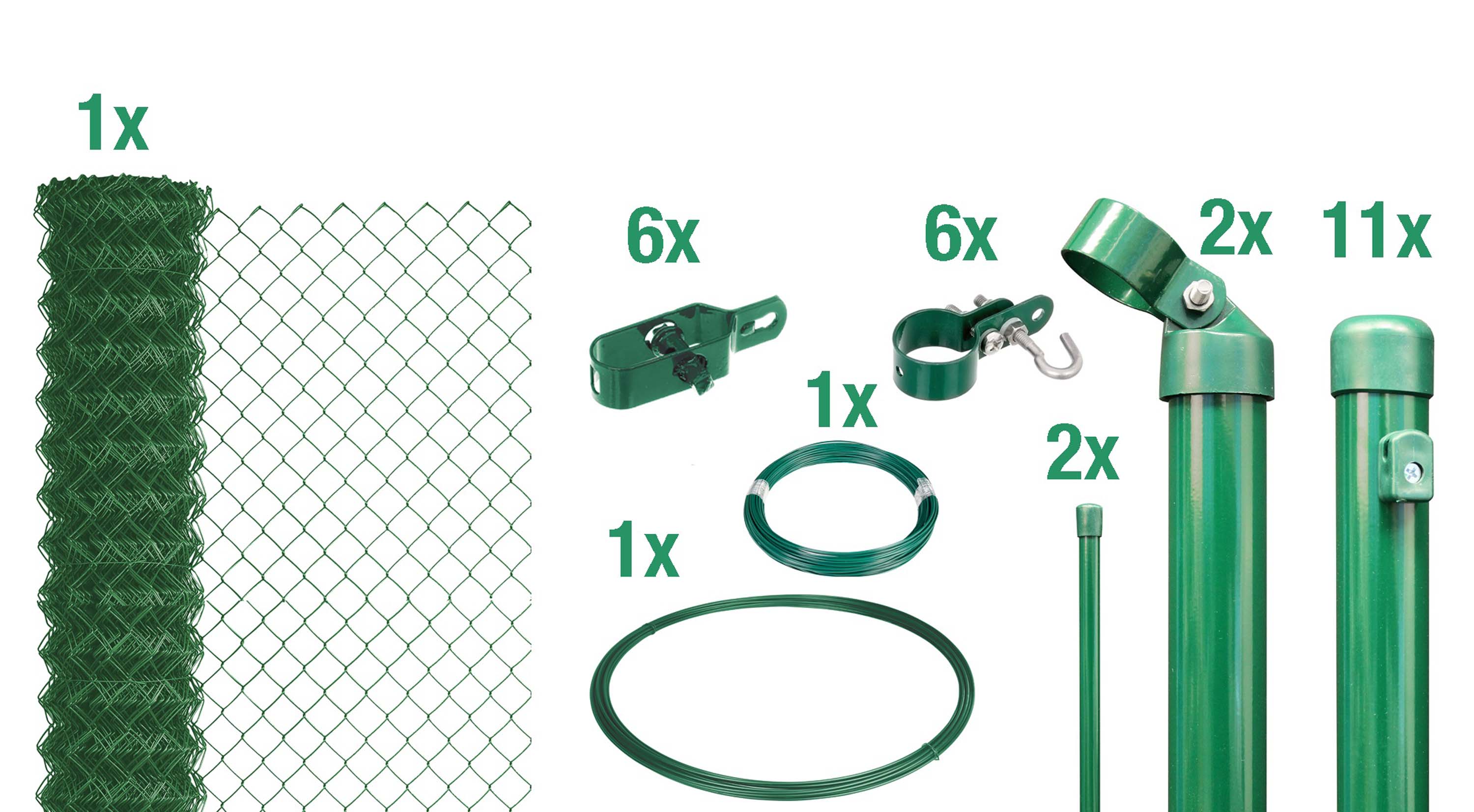 | Lieferumfang | 1 x Maschendraht-Geflecht, 11 x Zaunpfosten, 2 x Streben, 6 x Drahtspanner, 1 x Spanndraht, 1 x Bindedraht, 2 x Geflechtspannstäbe, 6 x Schellen |