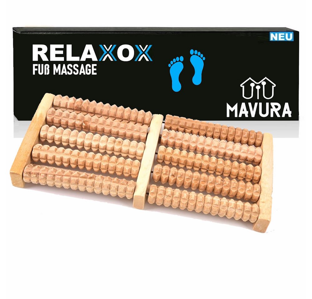 MAVURA RELAXOX Premium Fußmassageroller Holz Braun Fußmassagegerät - Entspannung auf Knopfdruck