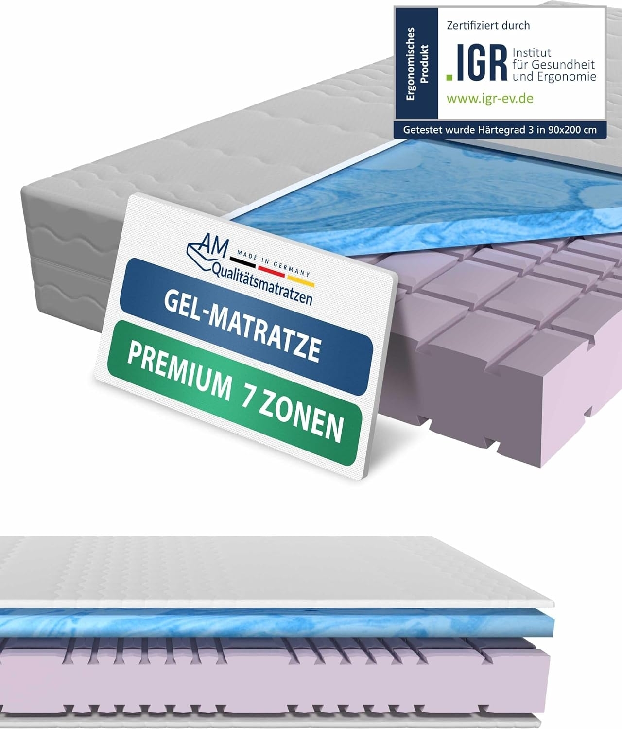 **Premium 7-Zonen Gelschaummatratze** * Integrierte Gelschaumauflage mit Memory-Effekt (6 cm, RG 50) * 7-Zonen Kaltschaumkern mit 3D-Konturschnitt (16 cm, RG 50) * Hochwertiger Bezug aus TENCEL Lyocell * Hergestellt in Deutschland **Beschreibung** **Die Premium 7-Zonen Gelschaummatratze** von AM Qualitätsmatratzen zeichnet sich besonders durch ihren einzigartigen Aufbau aus. So bildet ein 16 cm hoher 7-Zonen-Kaltschaum mit RG50 mit 3D-Konturschnitt das Herzstück der Matratze. Eine 6 cm hohe Schicht aus Gelschaum mit RG50 gibt unserer Gelmatratze ein angenehm weiches Liegegefühl und sorgt für eine optimale Druckentlastung der Wirbelsäule. Die Auswahl des Härtegrades wirkt sich nur auf die Stauchhärte des Kaltschaums aus, die weichen Eigenschaften des Gelschaums bleiben unverändert! **Der hochwertige Bezug** aus Lyocell mit versteppter Klimafaser (400 g/m²) besteht zu 63% aus Polyester und zu 37 % aus Lyocell. Er wirkt feuchtigkeits- und temperaturregulierend und ist bestens für Allergiker geeignet. Durch den 4-seitigen Reißverschluss lässt sich der Bezug leicht abnehmen und bei 60 Grad waschen. **Zertifiziert:** Unsere Gelschaummatratze ist Oeko-Tex® Standard 100 zertifiziert (19.0.86717 Hohenstein HTTI). Alle verarbeiteten Materialien sind auf Schadstoffe geprüft und für Allergiker geeignet. **Qualität Made in Germany:** Unsere Matratzen werden komplett in Deutschland gefertigt. Sogar die Bezüge werden in Deutschland genäht und nicht nur über den Matratzenkern gezogen, wie bei vielen anderen Angeboten, die mit Made in Germany werben. **Zufriedenheitsgarantie:** Wir sind von unserer Qualität überzeugt und möchten auch Sie überzeugen. Deshalb: **30 Nächte Probeschlafen**. Wenn Sie nicht zufrieden sind, holen wir die Matratze kostenlos wieder bei Ihnen ab. Ohne Wenn und Aber!
