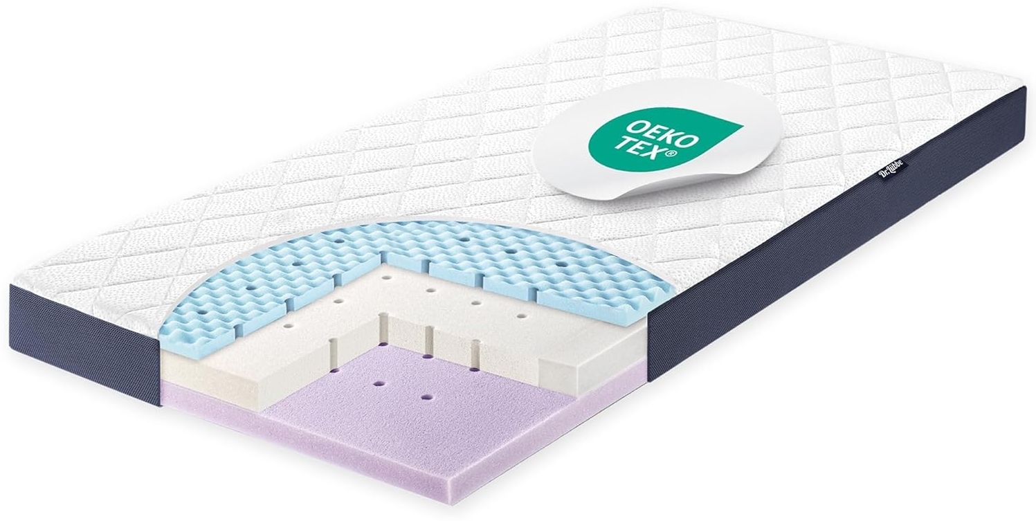 Die Baby Matratze DR. Lübbe new air Premium ist die neuste Version unseres bestsellers im Segment der hochwertigen DR. Lübbe Baby Matratzen. Der bewährte Aufbau nach dem 3-schicht-system erlaubt den Einsatz einer Mittel weichen Baby Seite, einer stabilen Kleinkind Seite und eines unterstützenden Matratzenkerns. Durch die Kombination von Mittel weichen und stabilen matratzenelementen wird eine optimale Unterstützung von baby's Wirbelsäule erreicht. Trittfeste Längskanten sorgen zudem für mehr Sicherheit bei den ersten Gehversuchen. Der abnehm- und teilbare Bezug aus atmungsaktivem Tencel Fresh & Dry funktionsgewebe ist bis 60°C waschbar. Der Bezug zeichnet sich neben seiner besonders hohen feuchtigkeitsaufnahmefähigkeit auch durch seine sehr gute Atmungsaktivität aus. DR. LÜBBE 3-SCHICHT PRINZIP - Die Kombination von mittelweichen und stabilen Matratzenschichten für maximalen Komfort und eine optimale Unterstützung der Wirbelsäule ab dem ersten Tag. BABY- & KLEINKINDSEITE - Die mittelweiche Babyseite ist optimal für das erste Lebensjahr geeignet. Danach bietet die stabile Kleinkind-Seite eine perfekte Schlafunterlage für ein gesundes Wachstum. FUNKTIONSBEZUG - Der Fresh & Dry Funktionsbezug mit TENCEL Fasern, besticht durch eine sanfte Oberfläche, hohe Atmungsaktivität und Feuchtigkeitsaufnahme, ist bei 60 Grad waschbar und allergikergeeignet. OEKO-TEX ZERTIFIZIERT - Alle Materialien sind nach OEKO-TEX Standard 100 Produktklasse I (Artikel für Babys und Kleinkinder bis zu 3 Jahren) geprüft und sind für Eltern und Kind absolut unbedenklich. DEUTSCHE HANDARBEIT - Julius Zöllner Babymatratzen werden exklusiv in unserem Werk in Nordbayern nach höchsten Qualitätsstandards gefertigt. Darauf sind wir stolz, und das bereits seit über 55 Jahren.