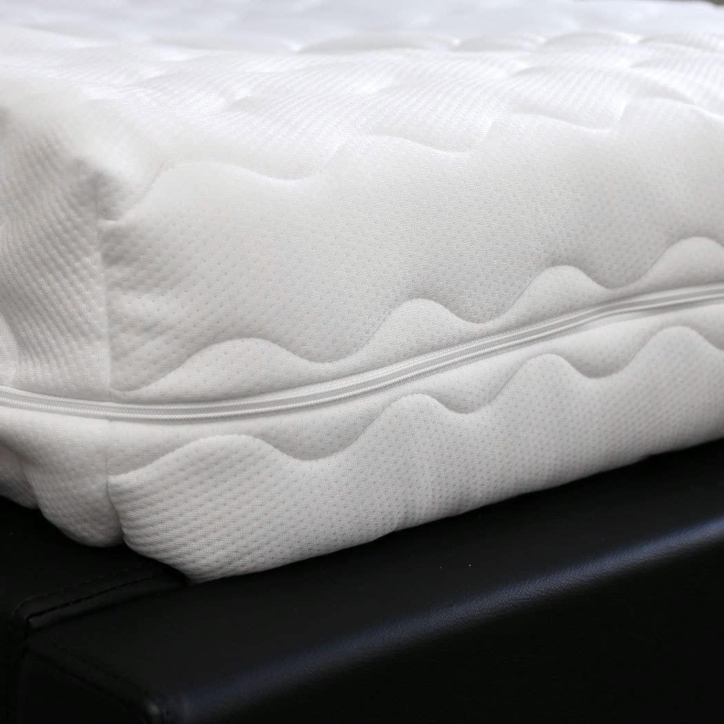 Erfrischen Sie Ihre Matratze mühelos mit dem Ersatz Matratzenbezug von BettwarenShop. Die Marke BettwarenShop bürgt für Qualität, denn der Bezug wurde in Deutschland hergestellt und ist allergikergeeignet. Bei Bedarf können Sie den Bezug problemlos bei bis zu 60°C waschen. Die clevere Konstruktion des Bezugs ermöglicht eine einfache Handhabung: Dank des rundum verlaufenden Reißverschlusses können Sie die Matratze spielend leicht beziehen und den Bezug für die Wäsche problemlos abnehmen. Die Doppeltuch-Strickware mit einem Gewicht von ca. 200g/m² sorgt für angenehmen Komfort und ist mit einer ansprechenden Wellensteppung verziert, die mit ca. 200g/m² Vlies versteppt ist. Für Allergiker ist dieser Bezug besonders geeignet und trägt zu einem gesunden Schlafklima bei. Bestellen Sie die passende Größe und Höhe entsprechend dem Kern Ihrer Matratze und verleihen Sie Ihrer Schlafunterlage ein frisches Aussehen mit diesem hochwertigen Ersatz Matratzenbezug. - Material: 100% Polyester - Verschluss: Reißverschluss - Materialart: Faser - Ökotex: Schadstoffgeprüfte Textilien nach Öko-Tex Standard 100, Prüf-Nr. 22.0.02374 Hohenstein - Waschen: Waschen bis 60°C - Bügeln: Nicht bügeln - Trocknen: Schonende Trocknung - Bleichen: Nicht bleichen - Reinigen: Nicht chemisch reinigen - Farbe: weiss
