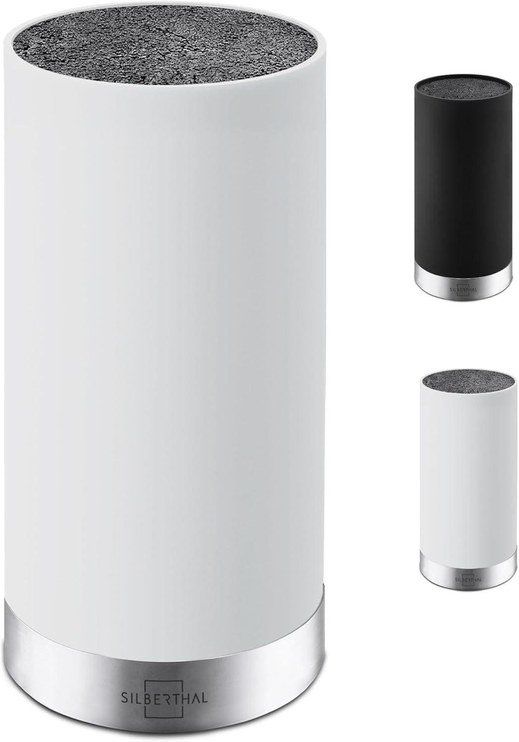 Der SILBERTHAL Messerblock ist unbestückt und bietet einen flexiblen Borsteneinsatz, der für alle Messerarten und -formen bis zu einer Länge von 20 cm geeignet ist. Mit einem Gewicht von 1.200 g und einem Anti-Rutsch-Boden sorgt er für Stabilität und Sicherheit in Ihrer Küche. Der Block bietet Platz für bis zu 10 Messer und lässt sich leicht reinigen, da der Einsatz entnehmbar ist. **Highlights** - Flexibler Borsteneinsatz schützt kostbare Messer und hält sie länger scharf - Anti-Rutsch-Boden sorgt für sicheren Stand - Geeignet für alle Messerarten und -formen bis 20 cm - Platz für bis zu 10 Messer auf 11 cm Durchmesser - Leichte Reinigung durch entnehmbaren Einsatz **Produkteigenschaften** - Anzahl Messersteckplätze: 10 St. - Gewicht: 1.200 g - Farbe: Weiß - Material: Edelstahl - Pflegehinweise: Handwäsche **Lieferumfang** - 1x Borsteneinsatz - Messer nicht im Lieferumfang enthalten