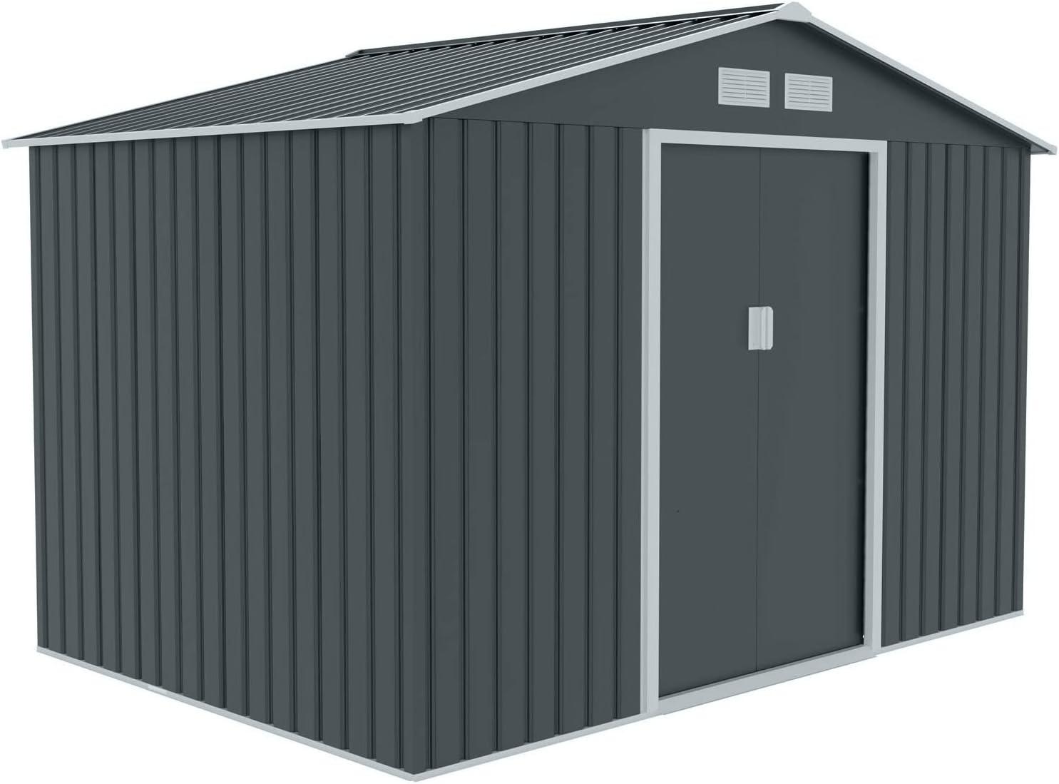 Das XXL Metall Gerätehaus von HATTORO in Grau/Anthrazit bietet Ihnen großzügigen Stauraum für Ihre Gartengeräte. Mit den praktischen Doppel-Schiebetüren und den integrierten Belüftungsgittern ist ein einfacher Zugang und eine optimale Luftzirkulation gewährleistet. Das wartungsfreie Gerätehaus aus lackiertem und verzinktem Stahlblech hat die Maße 277 x 191 x 192 cm (LxBxH) und ist ideal für den Außenbereich. **Highlights** - Großzügiger Stauraum für Gartengeräte - Leicht zugängliche Doppel-Schiebetüren - Belüftungsgitter für gute Luftzirkulation - Stabiles Fundament aus Metall für sicheren Stand - Zeitloses Design in Grau/Anthrazit **Produkteigenschaften** - Innenmaße: ca. 267 x 181 x 192 cm - Sockelmaß: ca. 267 x 181 cm - Firsthöhe: ca. 192 cm, Traufhöhe: ca. 152 cm - Breite der Tür: ca. 96 cm - 2x Schiebetür, 2x Belüftungsgitter - Satteldach für problemlosen Niederschlagablauf **Lieferumfang** - 1x Gerätehaus inkl. Metall-Fundament in grau - 1x Aufbauanleitung - Lieferung in 3 Paketen, ohne Bodenplatten und Dekoration