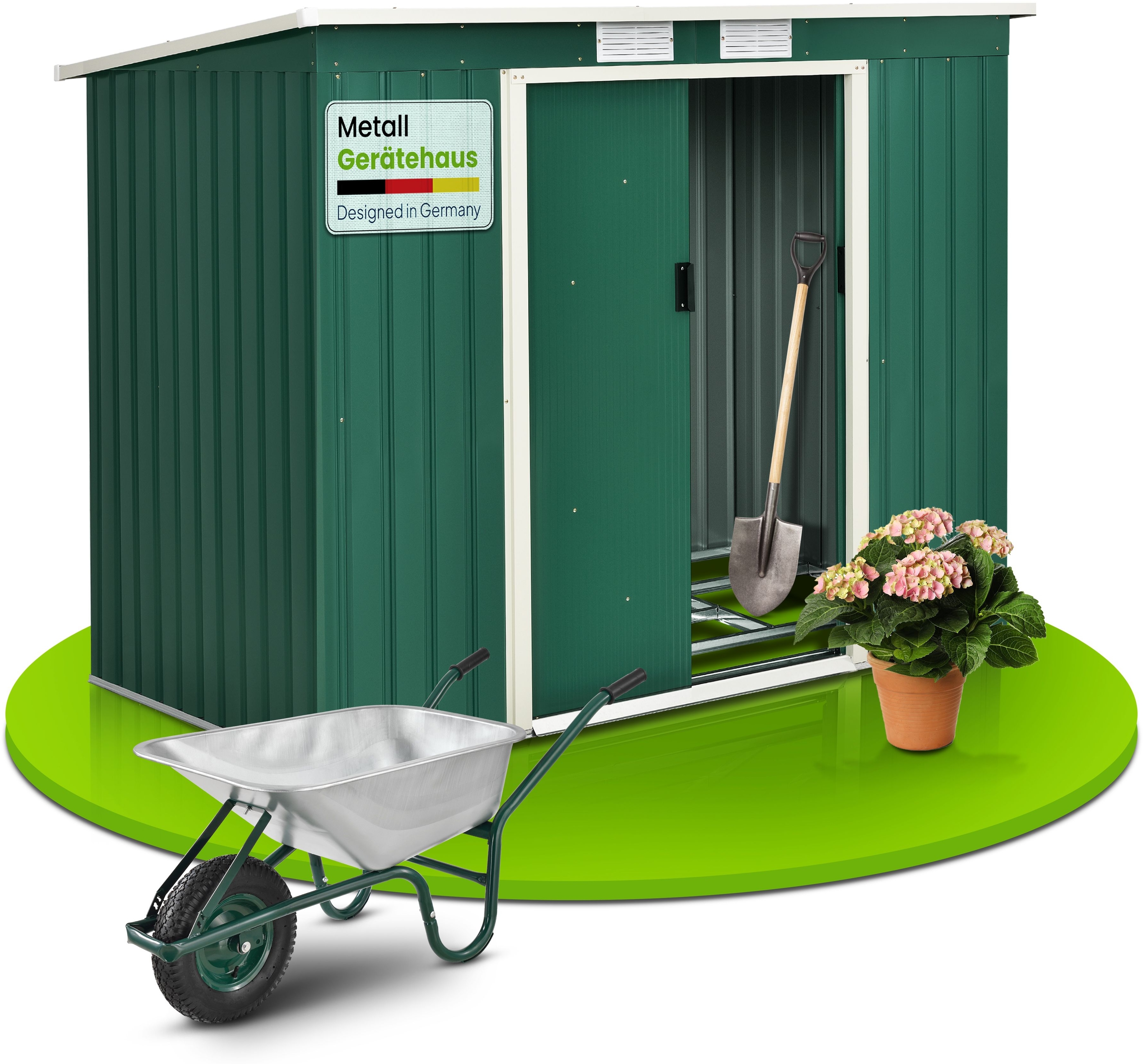 | Name | Juskys Metall Gerätehaus M mit Pultdach, Schiebetür & Fundament | 4m³ | 213×130×173 cm | grün | Geräteschuppen Gartenhaus Garten Schuppen |