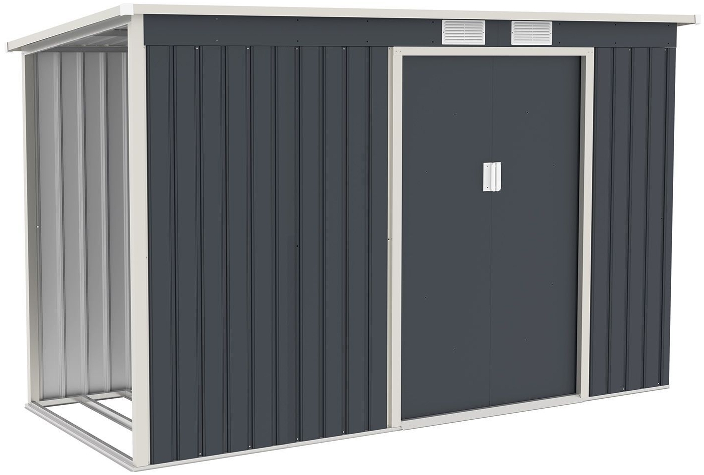 | Name | Juskys Metall Gerätehaus M mit Holzunterstand links, Schiebetür, Lüftungsgitter, Fundament - Geräteschuppen Gartenhaus Metallgerätehaus Holzregal |