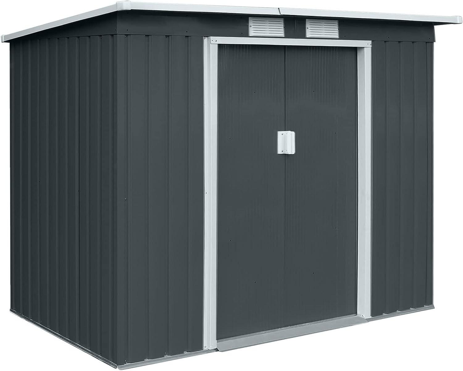 Das HATTORO P100 Metall Gerätehaus in Grau bietet Ihnen ausreichend Platz für Ihre Gartengeräte. Mit den praktischen Doppel-Schiebetüren und den integrierten Belüftungsgittern wird der Zugang erleichtert und eine optimale Luftzirkulation gewährleistet. Das stabile Stahlblechhaus mit Pultdach ist wetter- und schmutzbeständig und sorgt für eine sichere Lagerung Ihrer Werkzeuge. **Highlights** - Doppel-Schiebetüren für einfachen Zugang - Belüftungsgitter für gute Luftzirkulation - Stabiles Stahlblech in zeitlosem Design - Mit Fundament-Rahmen für Stabilität - Pultdach für reibungslosen Niederschlagablauf **Produkteigenschaften** - Maße (L x B x H): 213 x 130 x 173 cm - Innenmaße: ca. 203 x 117 x 170 cm - Sockelmaß: ca. 203 x 117 cm - Firsthöhe: ca. 173 cm - Traufhöhe: ca. 151 cm - Breite der Tür: ca. 96 cm **Lieferumfang** - 1x Gerätehaus inkl. Fundament-Rahmen (als Bausatz) - 1x Aufbauanleitung