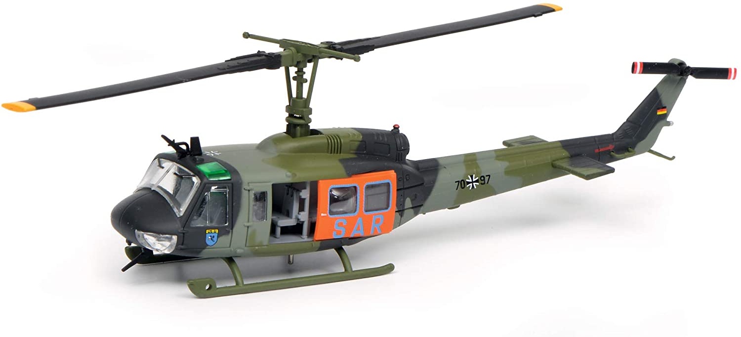 Als leichter Transport- und Mehrzweckhubschrauber konzipiert, erhielt die Bundeswehr im Frühjahr 1966 ihre ersten vier Exemplare des Bell UH-1D. Von den insgesamt 352 Bell UH-1D der Bundeswehr wurden 345 im Rahmen einer Lizenzproduktion bei der Firma Dornier hergestellt. 132 Stück wurden an die deutsche Luftwaffe ausgeliefert. Mit über 7. 000 gebauten Exemplaren ist der Bell UH-1 der mit Abstand meistgebaute Drehflügler der Luftfahrtgeschichte. Dem Bell UH 1D widmet Schuco ein Miniaturmodell im Maßstab 1:87. Bei den Modellen der Military sind sowohl die Karosserien als auch die Chassis aus Metall gefertigt. Wie von Schuco Modellen gewohnt, sind eine Vielzahl Details exakt nachgebildet und mit höchster Präzision verarbeitet worden. Achtung! Nicht für Kinder unter 14 Jahren geeignet. Achtung! Nicht geeignet für Kinder unter 3 Jahren.