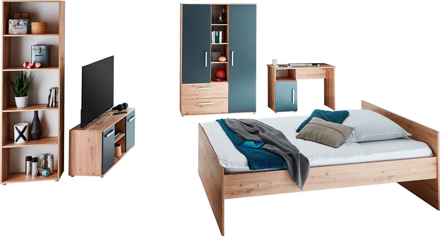 Das 5-teilige Jugendzimmer-Set »Alessio« von arthur berndt kombiniert modernes Design mit funktionalem Stauraum. Es umfasst ein Bett, einen Kleiderschrank, einen Schreibtisch, ein Standregal und ein TV-Lowboard, die durch ihre zweifarbige Gestaltung und trendigen Holzdekore bestechen. Die Möbel sind aus hochwertig beschichteten Holzwerkstoffen gefertigt und bieten pflegeleichte Oberflächen. Ideal für die individuelle Anordnung im Raum, sorgt das Set für Ordnung und Stil im Kinderzimmer. **Highlights** - 5-teiliges Set für umfassende Ausstattung - Zweifarbiges Design für moderne Akzente - Trendige Holzdekore als Blickfang - Hochwertige, pflegeleichte Oberflächen - Viel Stauraum für Kleidung und Schulutensilien **Produkteigenschaften** - Set besteht aus Bett, Kleiderschrank, Schreibtisch, Standregal und TV-Lowboard - Aus hochwertig beschichteten Holzwerkstoffen gefertigt - Ausgestattet mit Türen und Schubfächern - Elegante Bügelgriffe für einfache Bedienung **Lieferumfang** - 1x Bett - 1x Kleiderschrank - 1x Schreibtisch - 1x Standregal - 1x TV-Lowboard - Optional erhältlicher Lattenrost und Matratze nicht enthalten