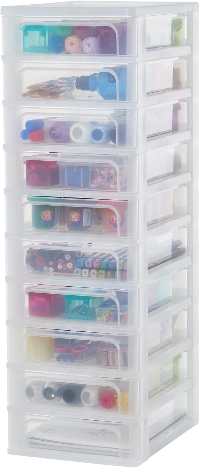 Iris Ohyama Schubladenschrank - der perfekte Organizer für Ihr Büro oder Wohnzimmer. Mit 10 Schubladen und einem Fassungsvermögen von 4 Litern bietet dieser Schubladencontainer ausreichend Platz für all Ihre Gegenstände. Die transparenten Schubladen ermöglichen eine einfache Sichtbarkeit des Inhalts. Der Schrank hat eine Größe von 26 x 35 x 81,5 cm (B x T x H) und die Schubladen haben die Maße 31,5 x 21,5 x 6,8 cm (B x T x H). Der obere Teil des Schranks ist speziell für kleine Gegenstände konzipiert. Die Schubladenstopper verhindern ein Herausfallen der Schubladen. Hergestellt aus transparentem Kunststoff (Polypropylen) und Made in France. **Highlights** - 10 Schubladen mit einem Fassungsvermögen von 4 Litern - Transparente Schubladen für einfache Sichtbarkeit des Inhalts - Kompaktes Design, ideal für kleine Räume - Spezieller Bereich im oberen Teil des Schranks für kleine Gegenstände - Schubladenstopper verhindern das Herausfallen der Schubladen **Produkteigenschaften** - Abmessungen: Außen: 26 x 35 x 81,5 cm (B x T x H), Innen (Schublade): 31,5 x 21,5 x 6,8 cm (B x T x H) - Material: Transparenter Kunststoff (Polypropylen) - Made in France **Lieferumfang** - 1 Schubladenschrank