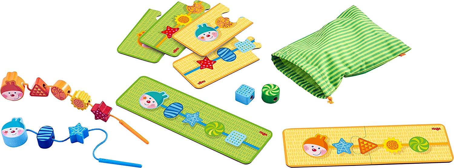 | Name | HABA 304653 - Fädelspiel Raupe, Lernspiel und Motorikspielzeug ab 18 Monaten, Holzfiguren zum Fädeln mit bunten Raupen- und Blumenmotiven |