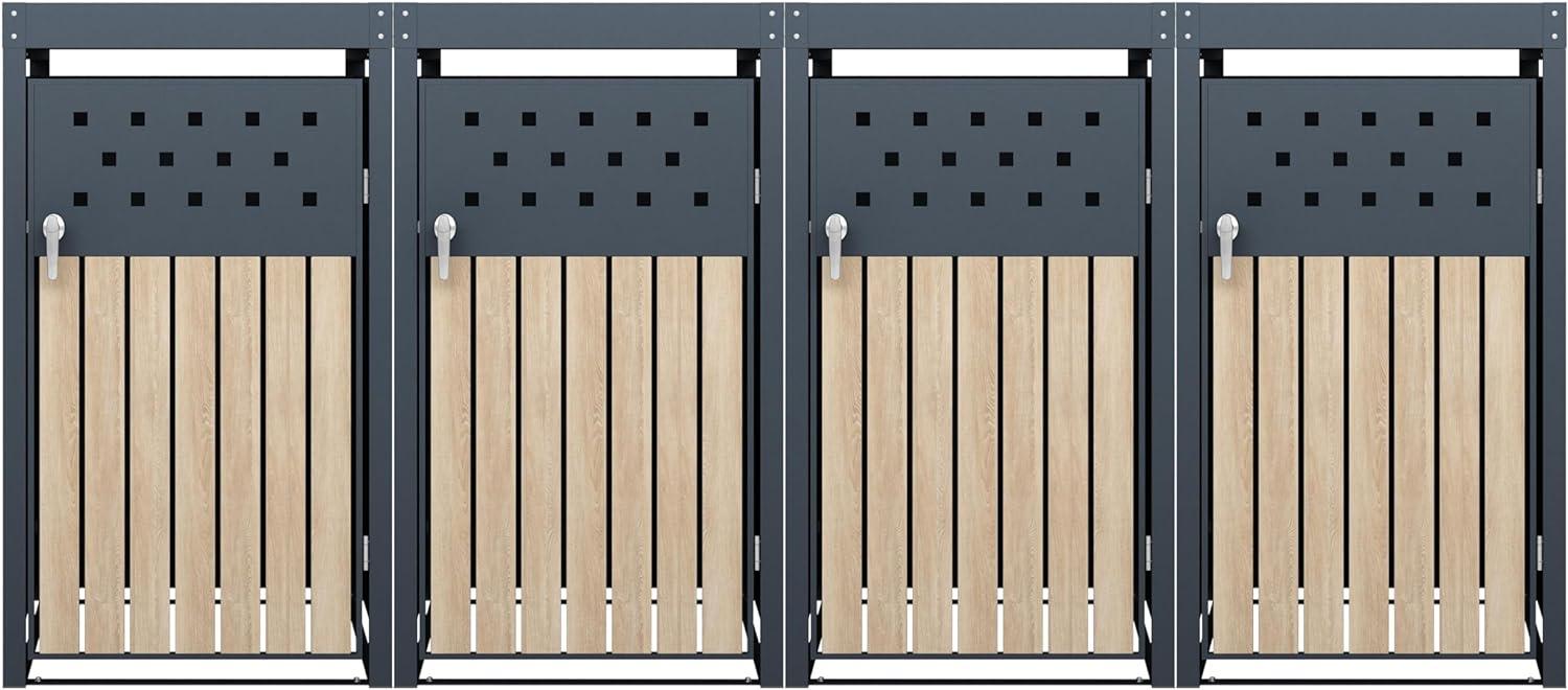Schützen Sie Ihre Mülltonnen vor Witterungseinflüssen mit unserer abschließbaren Mülltonnenbox in Anthrazit. Diese Box bietet Platz für Mülltonnen bis zu 240 Litern (max. 61 cm Breite, max. 116 cm Höhe) und ermöglicht durch die 4 Türen einen einfachen Zugang. Die integrierten Pflanzkästen mit Wasserablauflöchern sorgen für eine dekorative Note, während Belüftungsschlitze eine optimale Luftzirkulation gewährleisten. **Highlights** - Abschließbare Mülltonnenbox - Integrierte Pflanzkästen mit Wasserablauflöchern - Belüftungsschlitze für gute Luftzirkulation - Platz für Mülltonnen bis zu 240 Litern - Robuste Konstruktion aus verzinktem Stahl **Produkteigenschaften** - Material: Verzinkter Stahl, pulverbeschichtet in Anthrazit - Farbe: Anthrazit - 2 x 2 Türen - Außenmaße (BxTxH): 2 x ca. 132 x 80 x 124 cm - Maße Öffnung (BxH): 4 x ca. 61 x 116 cm - Maße Pflanzbox (BxTxH): 4 x ca. 68 x 80 x 8 cm