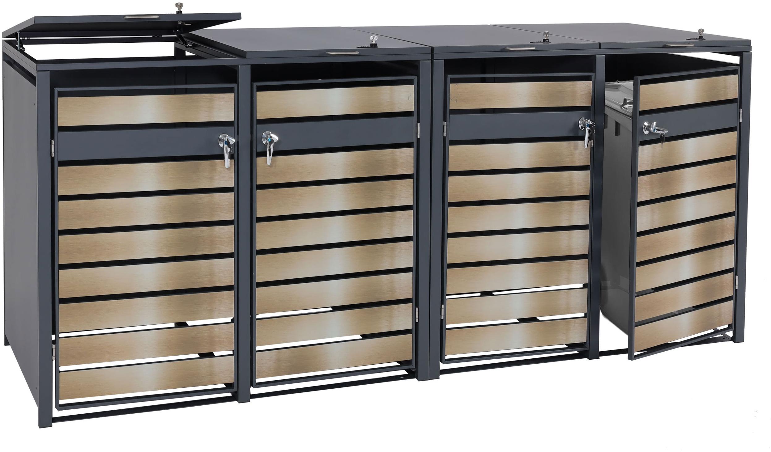 | Name | 4er Mülltonnenverkleidung HWC-J81, Mülltonnenbox, erweiterbar, Metall 100kg, anthrazit ~ gold |