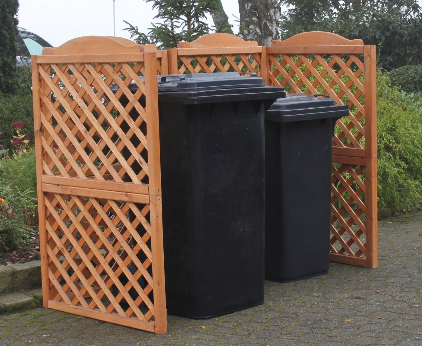 Ausstattung , Rückwand, |Anzahl Mülltonnen , 2 St., |Breite , 171 cm, |Tiefe , 79 cm, |Höhe , 127 cm, |Innenmaß Breite , 157 cm, |Innenmaß Tiefe , 72 cm, |Innenmaß Höhe , 127 cm, |Hinweis Maßangaben , Alle Angaben sind ca.-Maße., |Größe Mülltonne maximal , 240 l, |Holzart , Kiefer, |Material , Holz, |Farbe , honigbraun, |Oberflächenbehandlung , imprägniert, |
